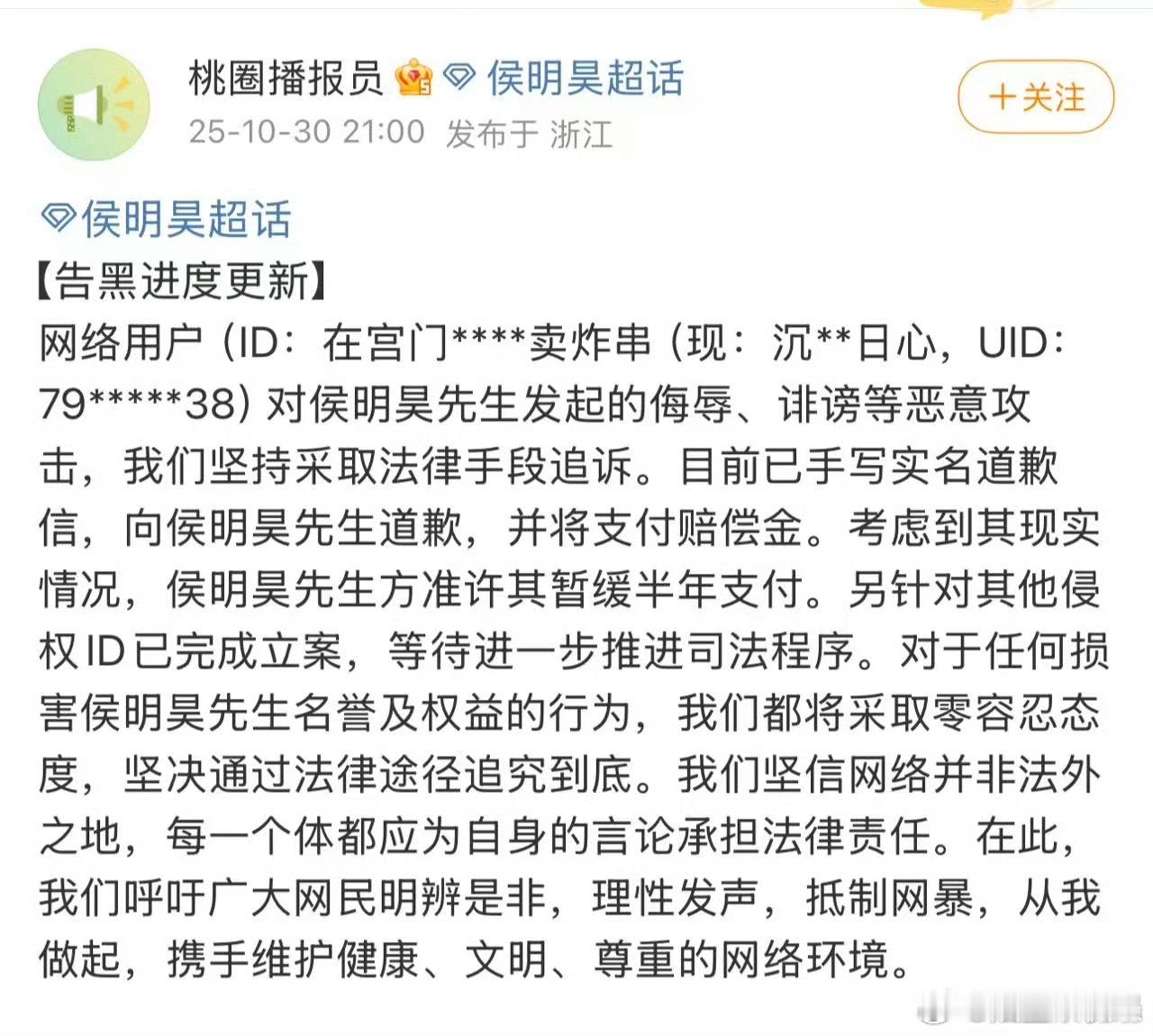 侯明昊告黑胜诉侯明昊黑粉手写道歉信 侯明昊告黑胜诉超解气!一位黑粉发实名手写道歉信,他还准许缓期付赔偿,其他告黑在推进,维护网络环境,超期待他的新剧!