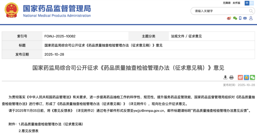10月28日,国家药监局发布《药品质量抽查检验管理办法(征求意见稿)》(以下简称《意见稿》),向社会公开征求意见至11月5日。作为2019年版办法实施后的首次重大修订,全文9章67条的新规不仅针对性新增“网络抽检”专章,更在监督管理、违法处理与信息公开等方面亮出“硬招”,既为网络售药平台划定明确行为边界,也为消费者用药安全筑牢全流程防护网。