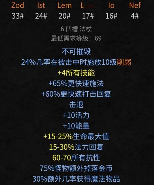 暗黑二重制版国服战网拍卖极品之着魔底材 六孔符文杖。 3雷系精通/支配闪电+3闪电新星+2传送。六孔。 着魔是重制版新增的符文之语,非赛也可以做,成品是4技能,65施法,70全抗,需要一颗33号符文。双手武器会损失盾牌格挡,正好适合顶球玩法,高施法可以尝试200施法档位。 这把顶级底材配合着魔可以拥有7闪电支配和7闪电新星,另外还赠送传送。不愧是顶级底材。 底价300,成交价990。 暗黑破坏神2重制版 暗黑2重制版