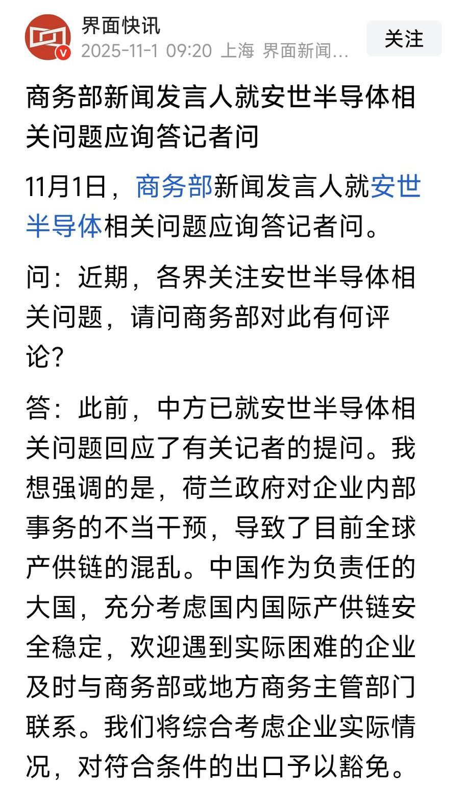 中方就安世半导体相关问题作出回应:欢迎有需求的企业与我们商务部们联系,对于符合条件的企业,我们都会给予豁免。而我最为关心的是,我们该如何反制荷兰。 荷兰无端对我们的合法企业下手,这无异于明抢,绝不能姑息。我们在海外有不少企业,如何保障这些企业的合法权益,是一个需要慎重考量的问题。