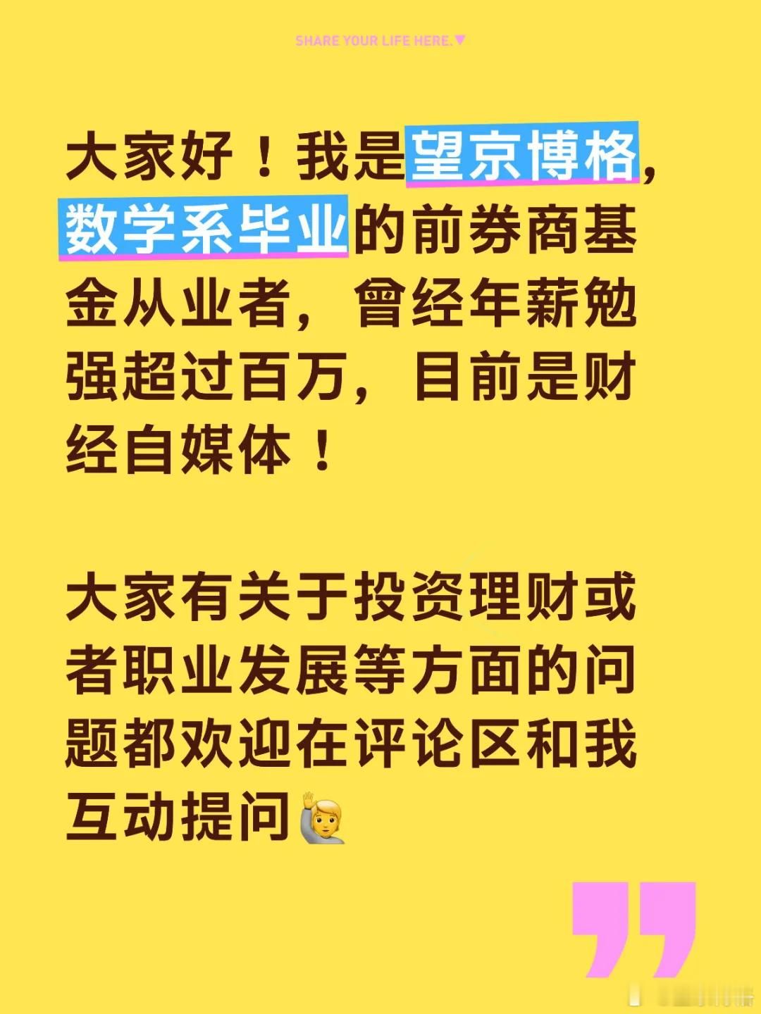 大家好!我是望京博格,数学系毕业的前券商基金从业者,曾经年薪勉强超过百万,目前是财经自媒体!