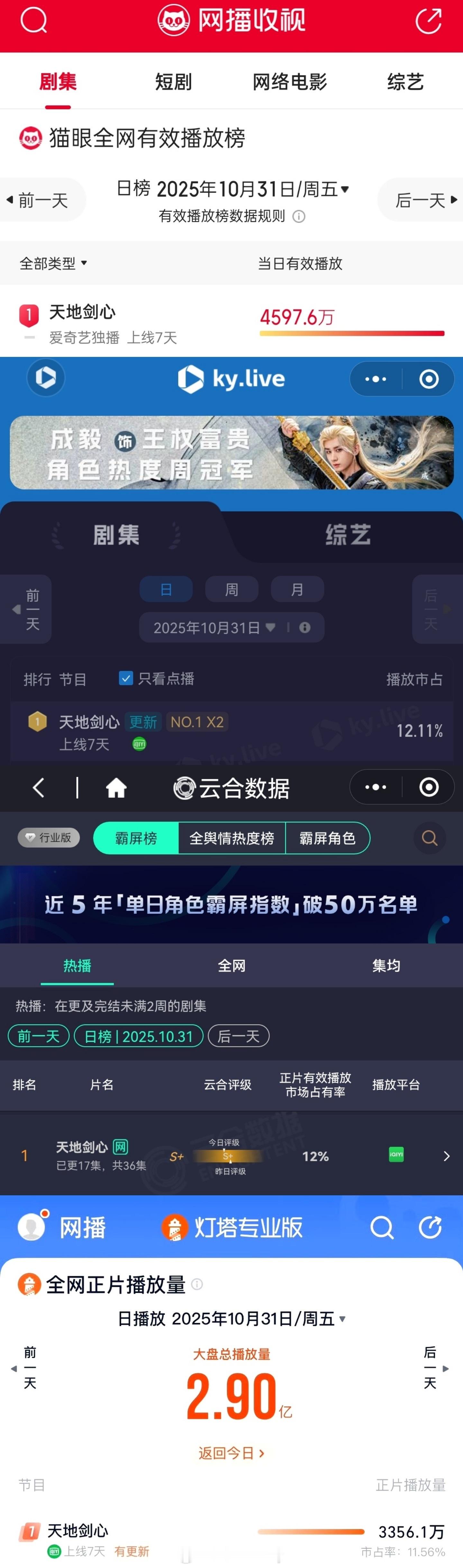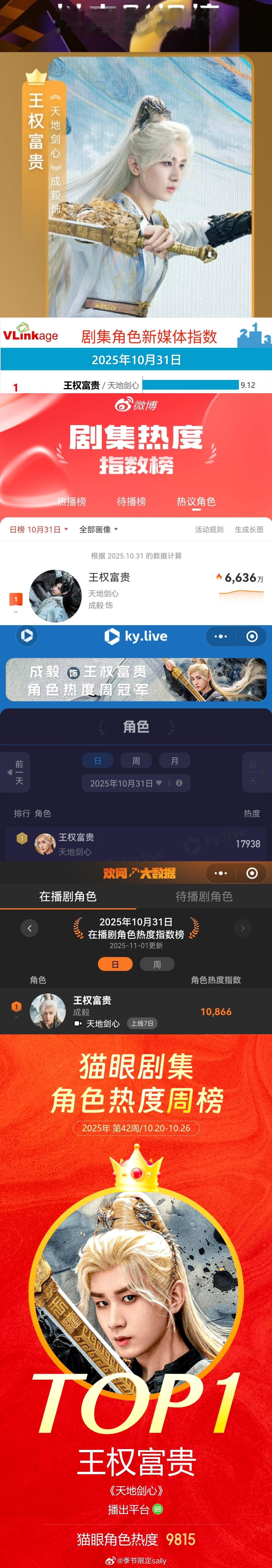 成毅王权富贵登顶10月角色热度榜冠军横扫全网各大平台热度第一🔥天地剑心登顶猫眼酷云云合灯塔全网播放量第一!