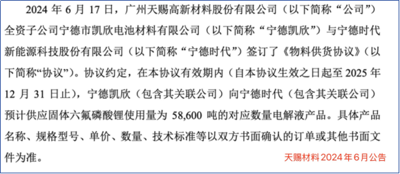 2024年6月17日,天赐材料发布与宁德时代签订物料供货协议的公告。协议时间持续一年多,在此期间内,公司要对宁德时代供应大量电解液产品。