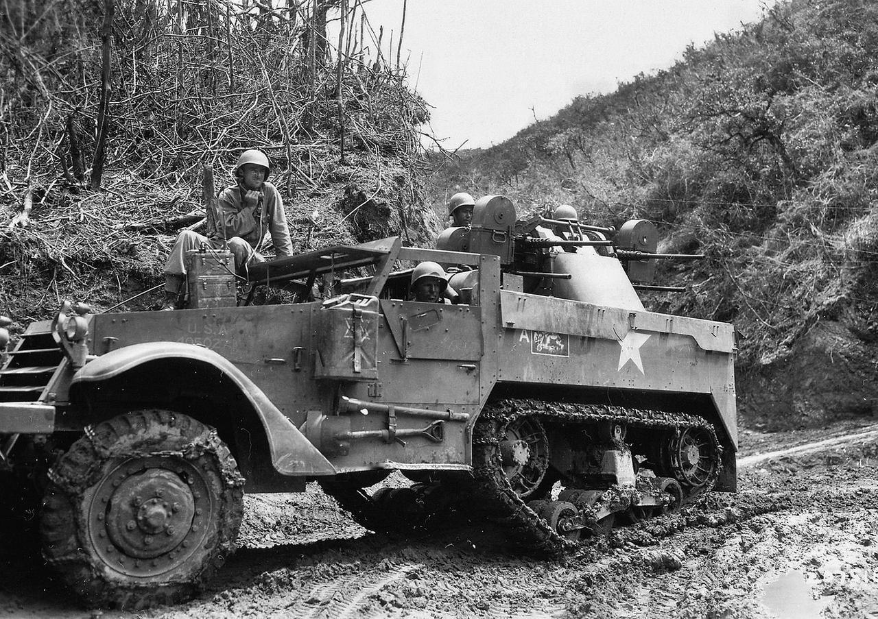 [呲牙] 鬼子在中国耀武扬威,动不动就白刃冲锋,但到南洋碰到这个可算是抓瞎了——1945年5月8日,菲律宾吕宋岛。美军第32步兵师的M16 MGMC半履带防空装甲车正严阵以待。 M16 MGMC(参见图2)是美军在二战中使用的半履带自行高射炮,全称为"M16多管高射炮车",以M3半履带车为基础加装四联装机枪塔,这个机枪塔集成了四挺12.7毫米M2HB重机枪,最高射速达2300发/分钟,有效射程约1000米,在欧洲战场主要用于应对低空攻击。不过在南洋嘛,大家都懂的~[呲牙] 第32步兵师,美军绰号”红箭师“的部队(参见图3),在太平洋战场参与过新几内亚战役和吕宋岛战役。