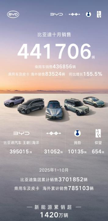 比亚迪10月销量达441706辆,其中乘用车销售436856辆,1-10月累计销量370万辆。 王朝 + 海洋:395015辆 方程豹:31052辆 腾势:10135辆 仰望:654辆 王朝海洋是大基本盘,方程豹是彻底起来了(钛7首个完整月就卖出了2万+),腾势看这次的N8L能不能起势,仰望这个数据还是很牛的。