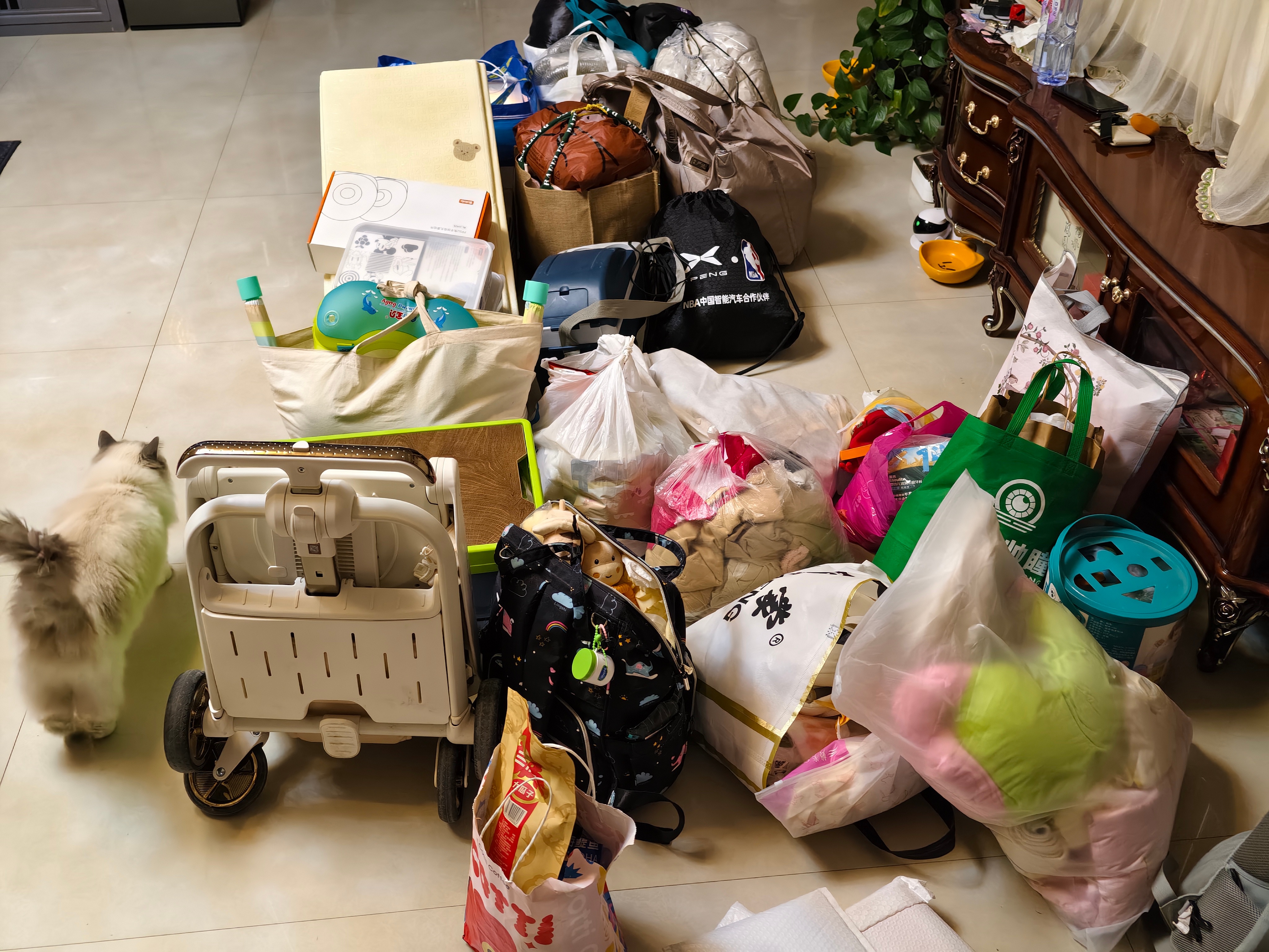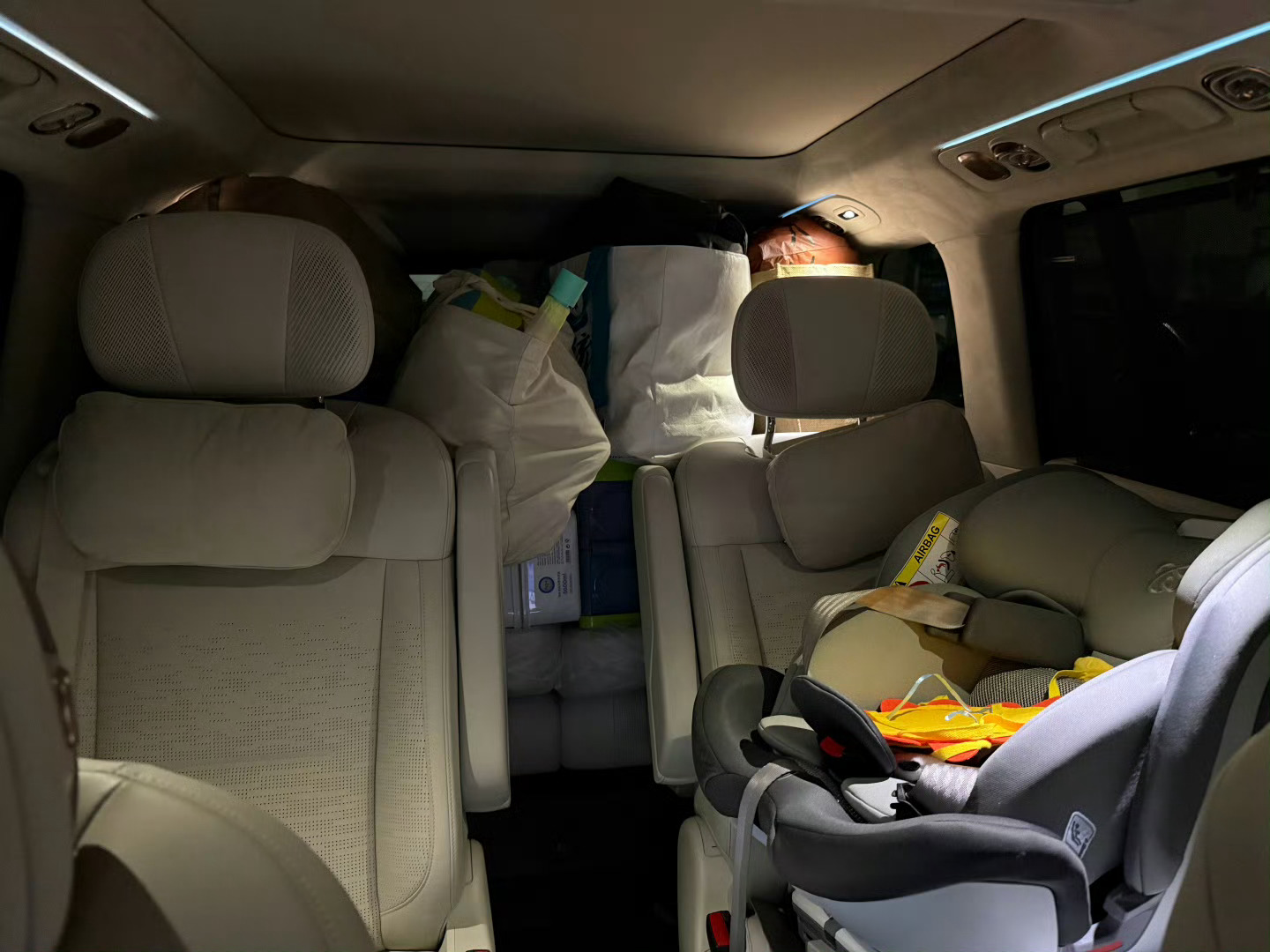 三个大人,一个婴儿(有安全座椅),两只猫