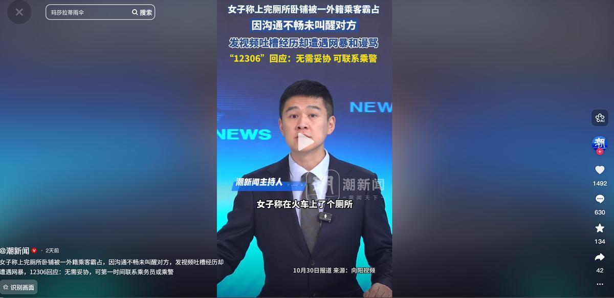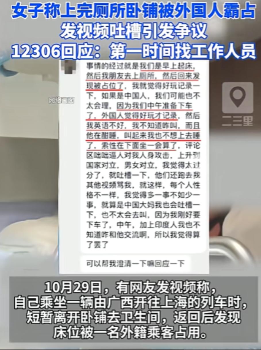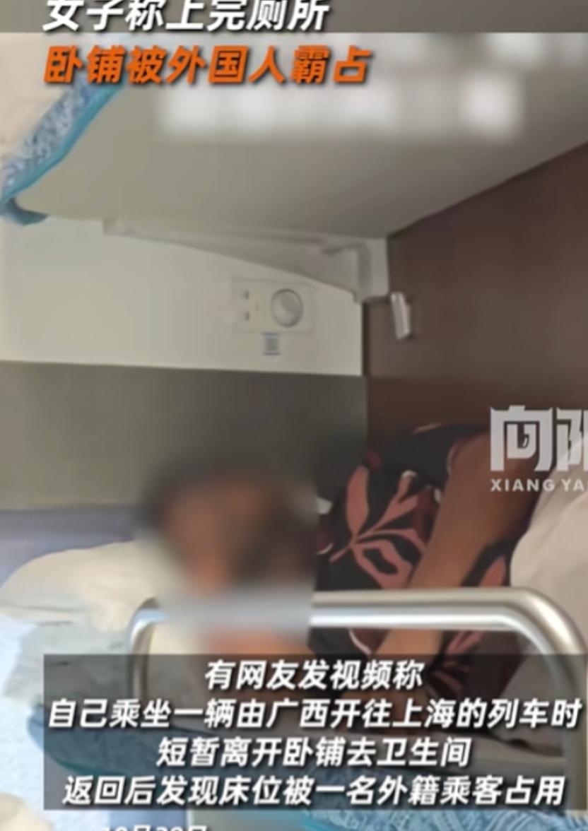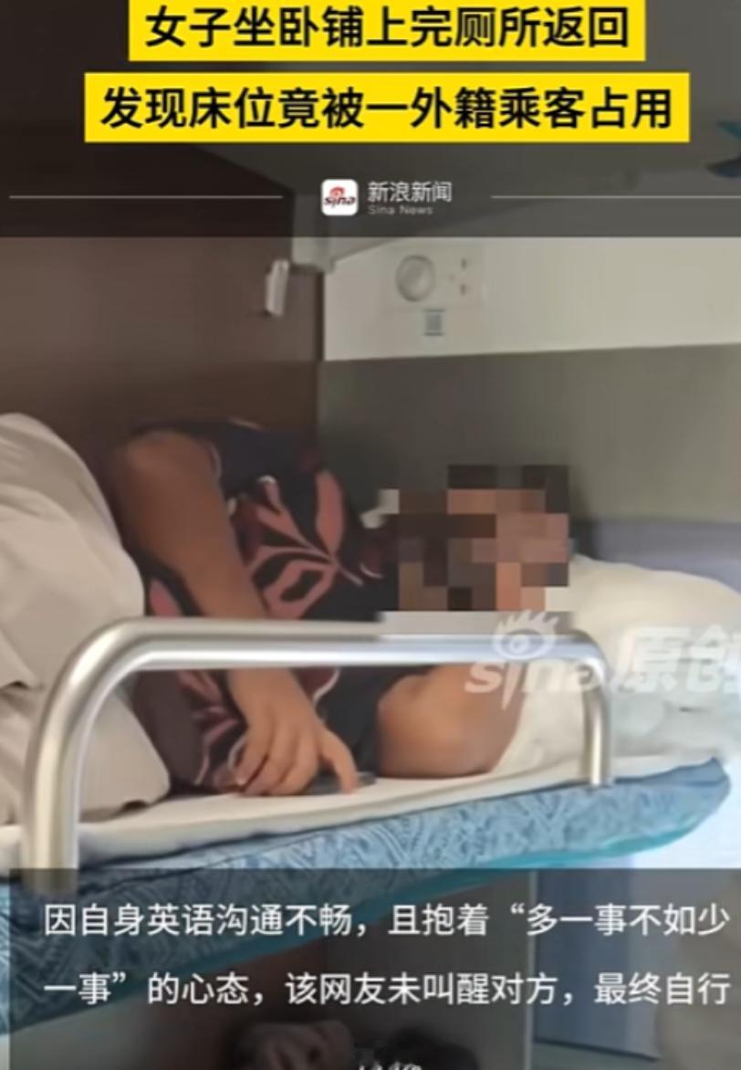 “无语了,”10月29日报道,广西一女生买卧铺去上海,结果她中途去了趟厕所,回来发现铺上竟然躺着一陌生男人,疑似印度人,正在呼呼大睡,女生由于不会说英语,怕和对方产生冲突,抱着“多一事不如少一事”的心态,只能忍气吞声,拍了视频发到网上,网友吐槽:今天占铺,明天就不知道占什么了。 小周是广西人前段时间要去上海办事,因为路程远她提前一周就在 12306 上抢了张卧铺票,想着长途火车能躺下歇会儿,总比坐着舒服,出发前还特意把洗漱用品和小毯子塞进背包,盘算着上车铺好被子,就能安安稳稳补补觉。 火车开出广西境内后,天慢慢黑了小周洗漱完准备回铺位睡觉,路过车厢连接处时,想着先去趟厕所再回去,省得半夜折腾,她没多想随手把背包放在铺位的小桌板上,就匆匆去了洗手间。 也就十来分钟的功夫,等她往回走远远就看见自己的铺位上好像躺着个人,心里还嘀咕 “是不是看错了”,走近了才发现,铺位上真的躺了个陌生男人,看样貌像是印度籍,盖着她刚铺好的小毯子,睡得正香,还打着轻轻的呼噜,她放在桌板上的背包被挪到了旁边的行李架上,挤在一堆箱子中间。 小周一下子就慌了站在铺位旁边,手都不知道往哪儿放,她想叫醒对方,可张了张嘴又把话咽了回去,她英语说得不好,平时也就会几句简单的 “你好”“谢谢”,真要跟对方解释 “这是我的铺位”,她怕自己说不明白对方再误会,万一吵起来车厢里人多,多尴尬啊。 她又想不然等对方醒了再说?可看他睡得那么沉,不知道要等多久,自己总不能一直站着,旁边铺位的阿姨看她站着不动,小声问她咋了,小周红着脸说 “那是我的铺位”,阿姨让她去找乘务员,说 “乘务员会英语,能帮你沟通”。 可小周又有点犹豫,觉得 “多一事不如少一事”,万一找了乘务员,对方觉得没面子,闹得不愉快,反而更麻烦,她咬咬牙,想着 “算了,忍忍吧”,就从行李架上拿了背包,在过道的折叠椅上坐了下来。 折叠椅又硬又窄,坐久了腿都麻了,小周看着窗外黑漆漆的夜景,心里又委屈又后悔,自己明明买了票,却只能在过道坐着,而那个陌生男人占了她的铺位睡得安稳。 她拿出手机偷偷拍了段视频,没拍男人的脸,就拍了铺位和自己坐的折叠椅,发在了网上,配了句 “无语了,自己的卧铺被占,不会英语不敢说”。 没想到视频发出去没多久,就有好多网友评论,有人吐槽 “这也太欺负人了,今天敢占铺明天还不知道敢占啥呢”,有人说 “妹子太老实了,该找乘务员啊,他们有翻译工具,肯定能解决”。 还有人分享自己的经历,说之前在高铁上遇到过类似的事,找了乘务员,很快就处理好了,对方还道歉了,小周看着评论越看越后悔,觉得自己当时要是勇敢点,找乘务员帮忙,也不用在过道坐那两个小时,最后腿麻得站都站不稳,觉也没睡好,第二天整个人都没精神。 后来小周跟朋友说起这事,朋友都怪她 “太忍了”,说 “维护自己的权利不丢人,你买了票,那个铺位就是你的,凭啥要让给别人”。 小周想想也对,她现在也常跟身边人说,以后再遇到这种事,可不能再 “多一事不如少一事” 了,该找工作人员帮忙就找,不然委屈的还是自己,而且她也希望其他人遇到类似情况,别像她一样犹豫,毕竟公共场合有规则,守规矩的人就该好好维护自己的权益。 (信息来源:潮新闻)