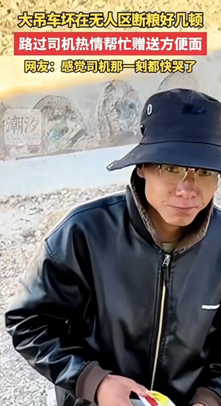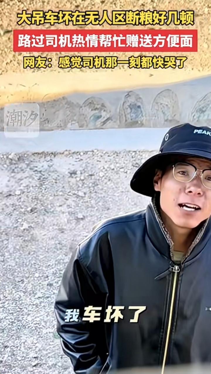 近日羌塘无人区一位大吊车司机车坏了被困数日,自己带的干粮有限已经几天没吃饭了,看着不能动的庞然大物和自己越来越扁的肚子,车上唯一的饮食就是矿泉水,再这样下去车子没修好自己可能会被……想着想着他鼓起勇气向过往的车辆询问是否可以给点吃的,一连几辆车都没有备干粮,他显得心灰意冷可想起自己是家里的顶梁柱,无论如何都要度过这一次难关。 就在他准备转身去吊车里休息会时忽然一辆卡车过来了,他急忙打招呼,司机看他整个人虽然精神可总觉得少点什么,于是询问怎么了师傅,他也顾不上那么多了就开口道:师傅车里有没有吃的,我的车坏了已经几天没吃饭了,司机啊非常惊讶的说:我…我只有那个干脆面,就是我自己平时爱吃的零食解解馋的,要不都给你吧! 吊车司机说:非常感谢我实在是饿到了,他接过三包干脆面不停的道谢,卡车司机有问需要水吗有几瓶矿泉水,吊车司机说:水我有真的非常感谢。 此时他的表情已经非常复杂,几天的饥饿没有让他觉得委屈,可陌生人的几包干脆面,却让他感激中已经无法言语,似乎哽咽眼神却异常坚定,就像过交情的朋友一样一切都在心里了。