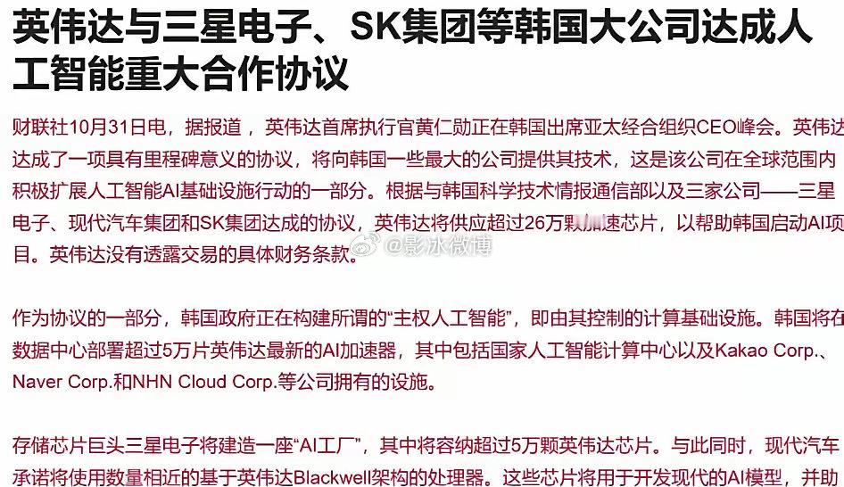 全球AI算力领域再迎重磅突破,英伟达近期动作频频,不仅与三星电子、SK集团、现代汽车等韩国及全球头部企业达成多维度AI重大合作,更以超26万颗加速芯片的供应规模,推动全球算力基建提速,彰显AI产业“良性循环”的强劲发展态势。
