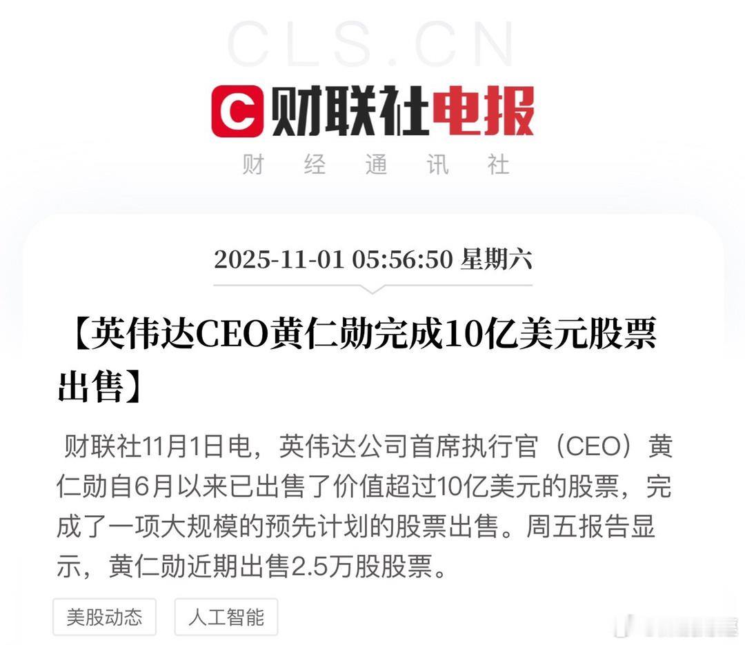 黄仁勋抛售英伟达股票喜得10亿美元!