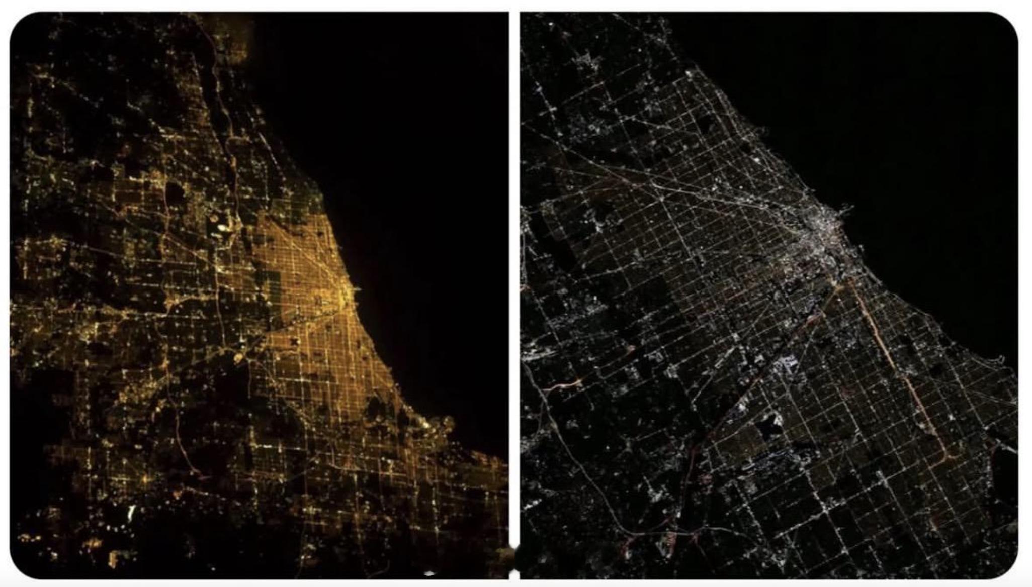从太空中可以看到从钠灯到 LED 的转变。 (芝加哥 2011 年 vs 2024 年的对比)