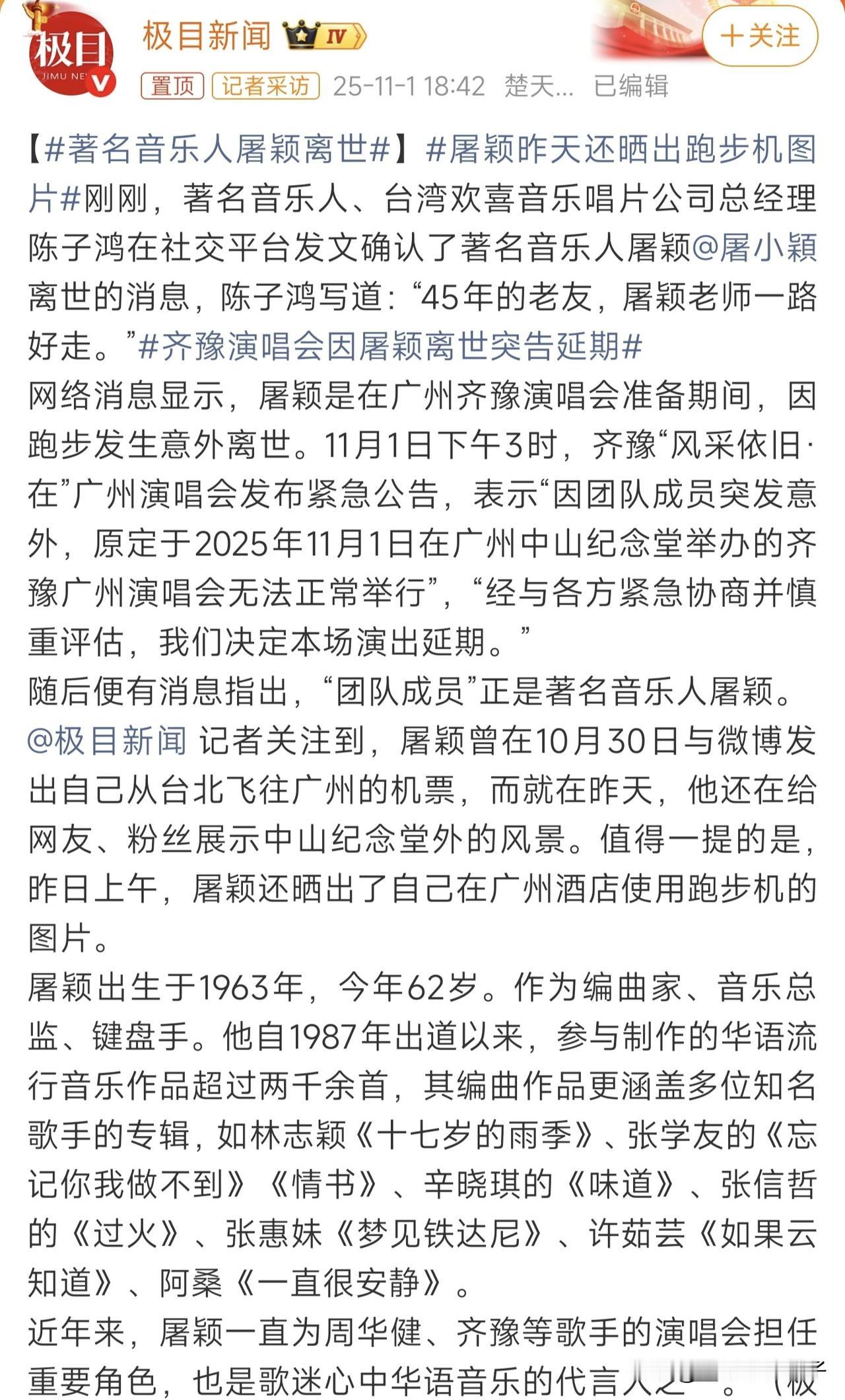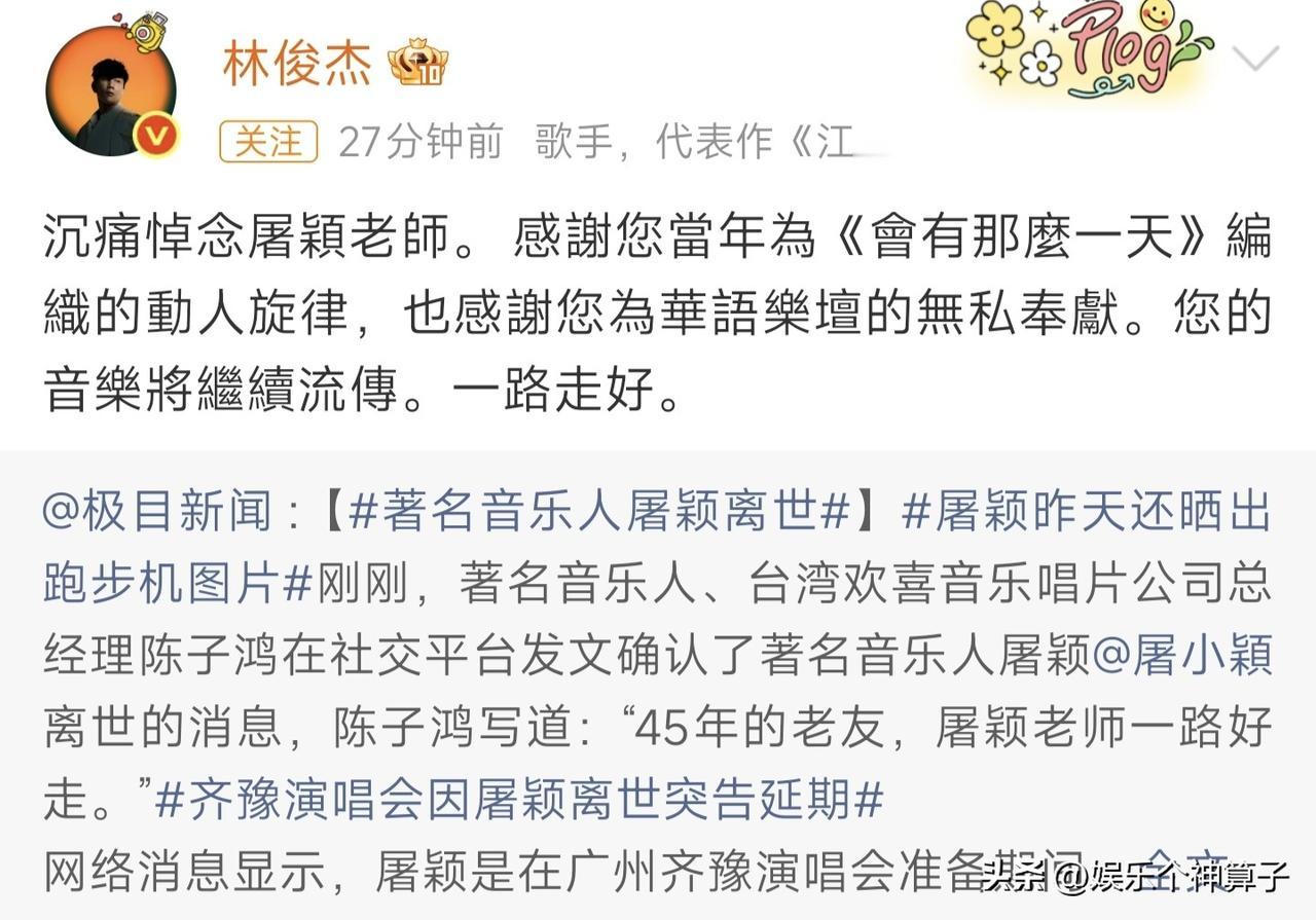 万万没想到,音乐人屠颖如此厉害,看到去世的消息,深感惋惜! 11月1日,据媒体报道,知名音乐人屠颖去世,享年62岁,昨天还更新动态,有点猝不及防。 说实话,刚看到消息,名字很陌生,觉得应该没啥名气,也没啥作品,然而,到网上科普一番,直接傻眼了,深深被震撼到了,简直就是音乐大师级别。 给林志颖、张学友、张信哲、许茹芸等都写过歌,这可都是大牌歌手,而且编曲的作品耳熟能详,传唱大街小巷,真的是发自内心的敬佩! 林俊杰在社交平台发文悼念屠颖,言语中表达悲伤与不舍,称谓老师,可见内心无比的尊敬,毕竟,好歌手遇到好的音乐人,才会碰撞出不一样的火花。 真的觉得自己有点孤陋寡闻,如此优秀的一位音乐人,以前竟然毫无印象,毫不夸张的说,屠颖去世,真是乐坛的损失。 愿逝者安息,一路走好!