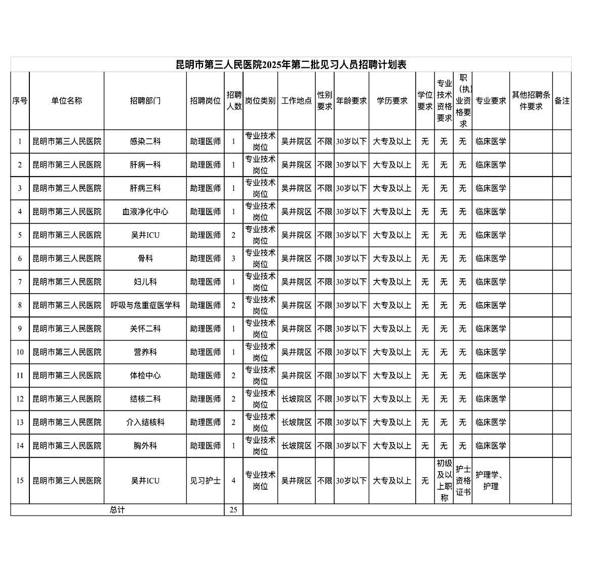 昆明市第三医院,就放出来25个见习名额。 那可是西南地区规模最大的传染病医院之一。 好多医学生挤破头想进去的地方。 我有时候刷到这种招聘,都替现在的孩子们捏把汗。 想想自己当年,为了一个好单位的实习机会,简历改了十几遍,面试前一晚紧张得翻来覆去睡不着。 现在的竞争,只会有过之而无不及。 就5天报名时间,11月1号到5号。 眼睛一眨,就错过了。 这种机会,真的就是给有准备的人留的。 不是给那些等着天上掉馅饼,刷到信息了才“哦”一声的人。 这25个名额,看着是“见习”,其实是什么? 是一张入场券。 一张能让你半只脚踏进顶尖医疗圈子的入场券。 履历上添上这么一笔,以后去哪儿腰杆子都硬一点。 唉,加油吧,后浪们。