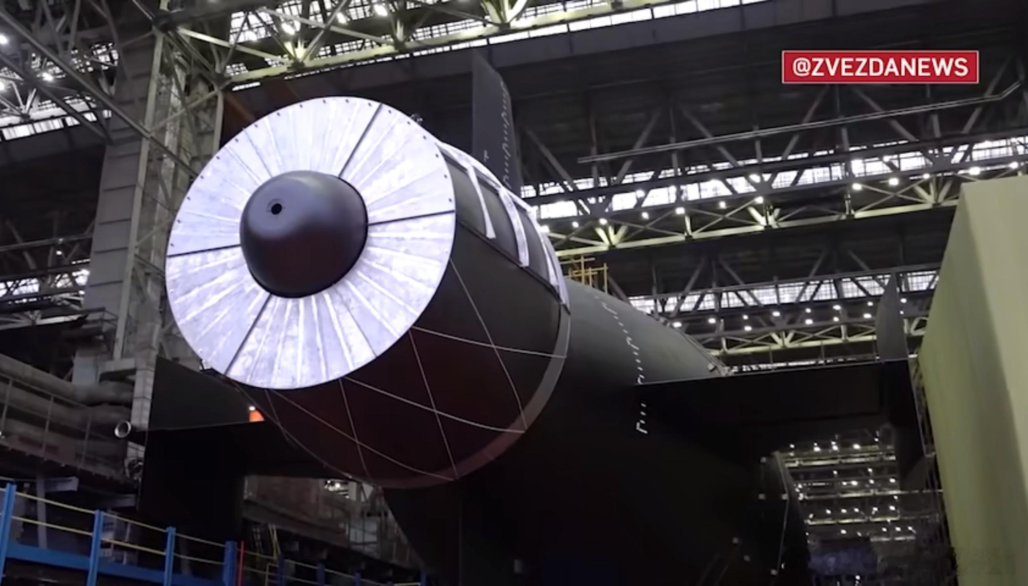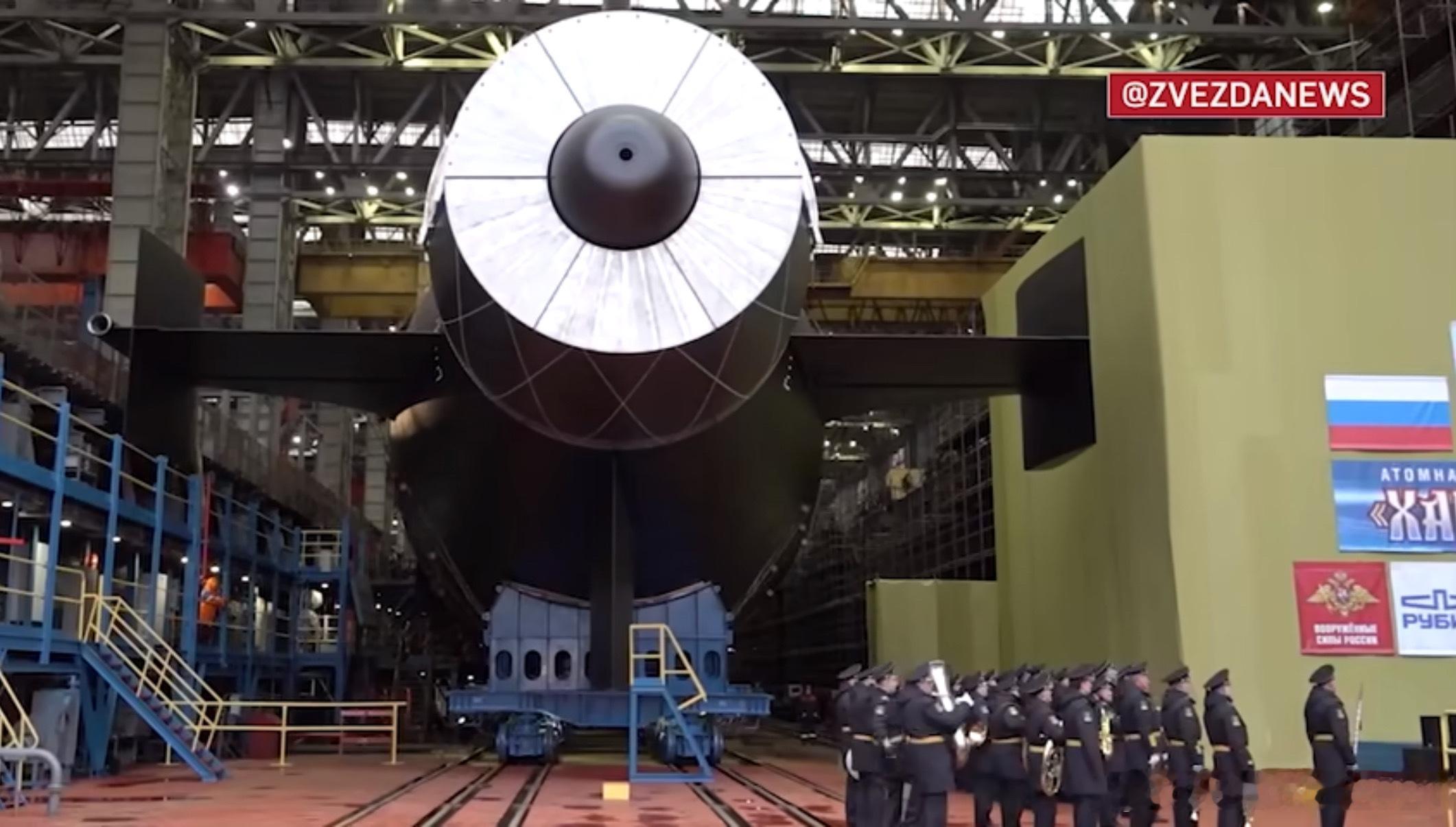 搭载波塞冬核动力鱼雷的哈巴罗斯夫克号核潜艇出厂接受视察、明显的巨型泵推,俄罗斯的核潜艇技术还是一流的。