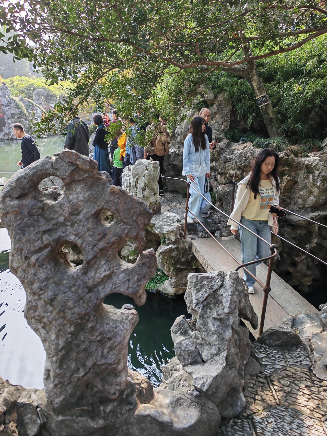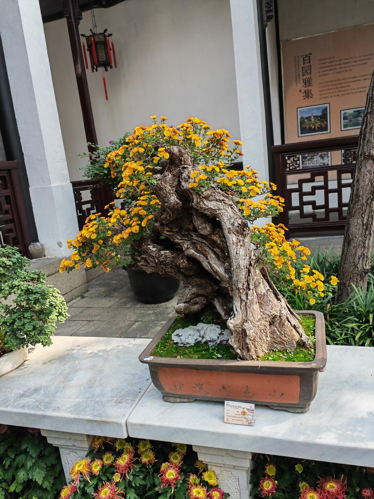 我的今日状态:🏝️旅行度假 我这里的天气:☀️晴天 今日游赏狮子林,刚入园便被错综迷离的假山阵摄住心神。太湖石堆叠出千姿百态,似狮吼龙腾,恍若闯入奇幻兽境。穿行其间,曲径通幽处忽见豁然开朗,粉墙黛瓦与嶙峋山石相映成趣。 恰逢2025金秋菊展,各类菊花沿廊布展,塔菊层叠如霞,悬崖菊垂瀑而下,金丝银蕊与青砖灰瓦交织,绘就一幅活色生香的园林画卷。暮色渐沉时,仍徘徊于菊影山石间,不舍这方移步换景的江南雅境。 夕阳西下,不舍离去,狮子林的美景令人陶醉。