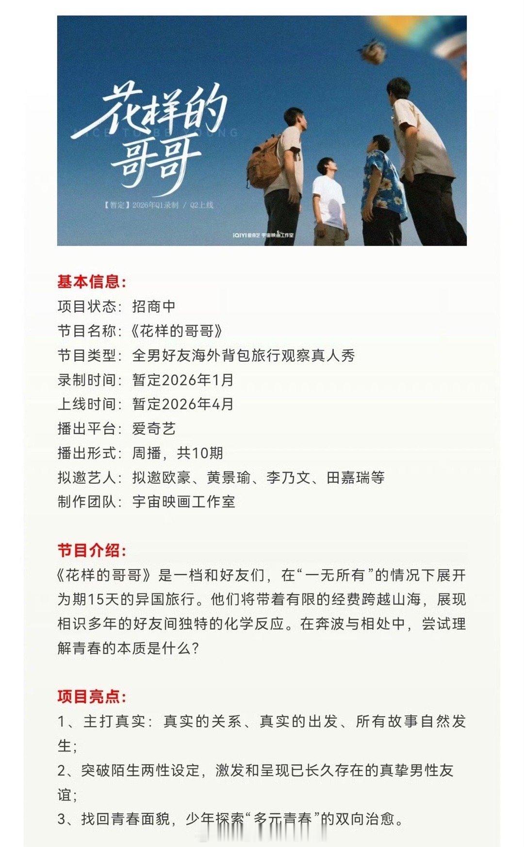 这又是啥样的神仙阵容啊,背 包 真 人 秀 《花样的哥哥》又有新消息了,网传第一季的节目嘉宾有:黄景瑜、欧豪、田嘉瑞、李乃文。就是说能找来这几位男艺人,节目组有心了啊。叔圈和鲜肉同框,荷尔蒙拉满了~