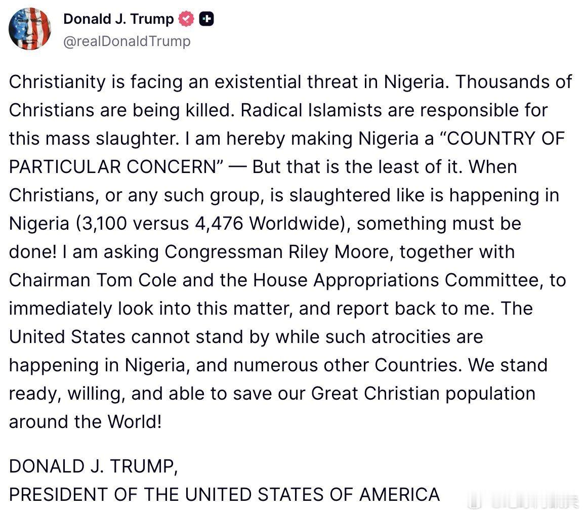 此前,特朗普在社媒发文:“基督教在尼日利亚正面临生存危机。成千上万的基督徒正在被杀害。极端伊斯兰分子应对这场大规模屠杀负责。我在此将尼日利亚指定为“特别关注国家”——但这只是最起码的措施。当基督徒或其他类似群体像在尼日利亚这样被屠杀(尼日利亚3100人对比全球4476人)时,我们必须采取行动!我要请国会议员莱利·摩尔,与汤姆·科尔主席以及众议院拨款委员会一起,立即调查此事,并向我汇报。美国不能袖手旁观,任由此类暴行在尼日利亚以及众多其他国家发生。我们随时准备好、愿意并有能力拯救全球伟大的基督徒群体!”