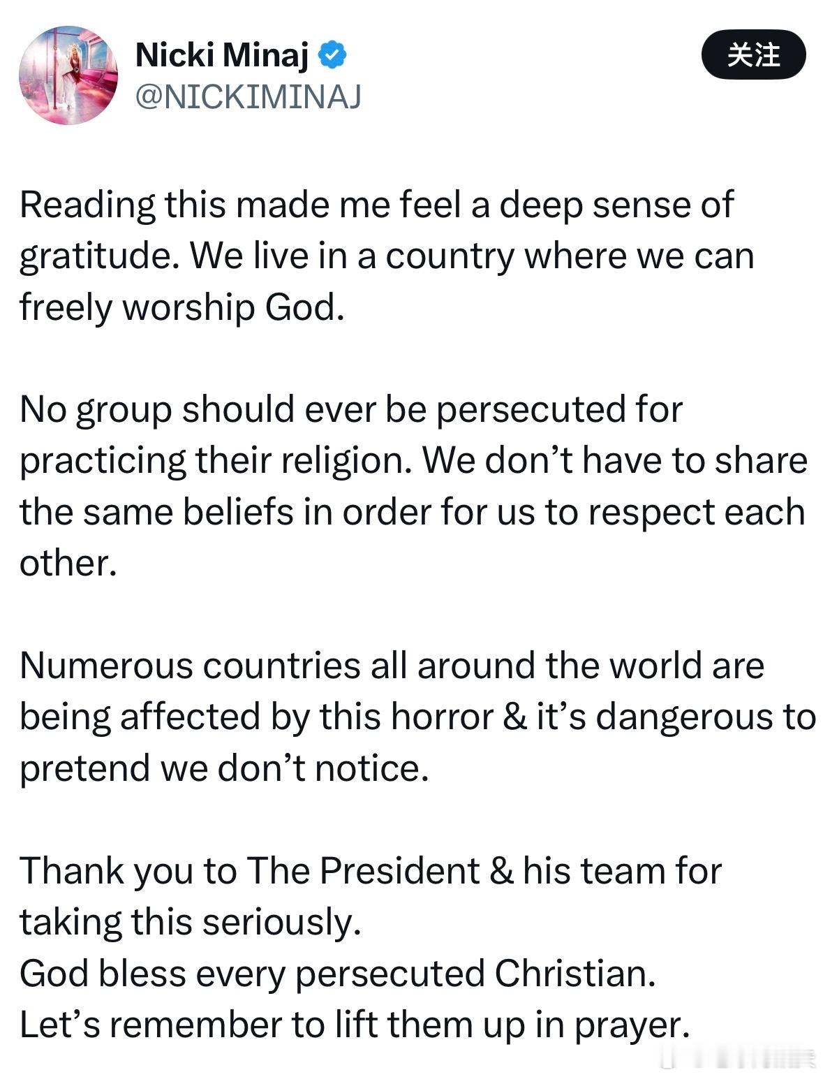 ‼️美国知名说唱歌手Nicki Minaj(麻辣鸡)发文感谢特朗普: