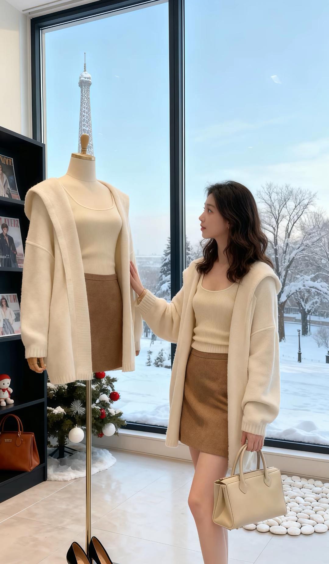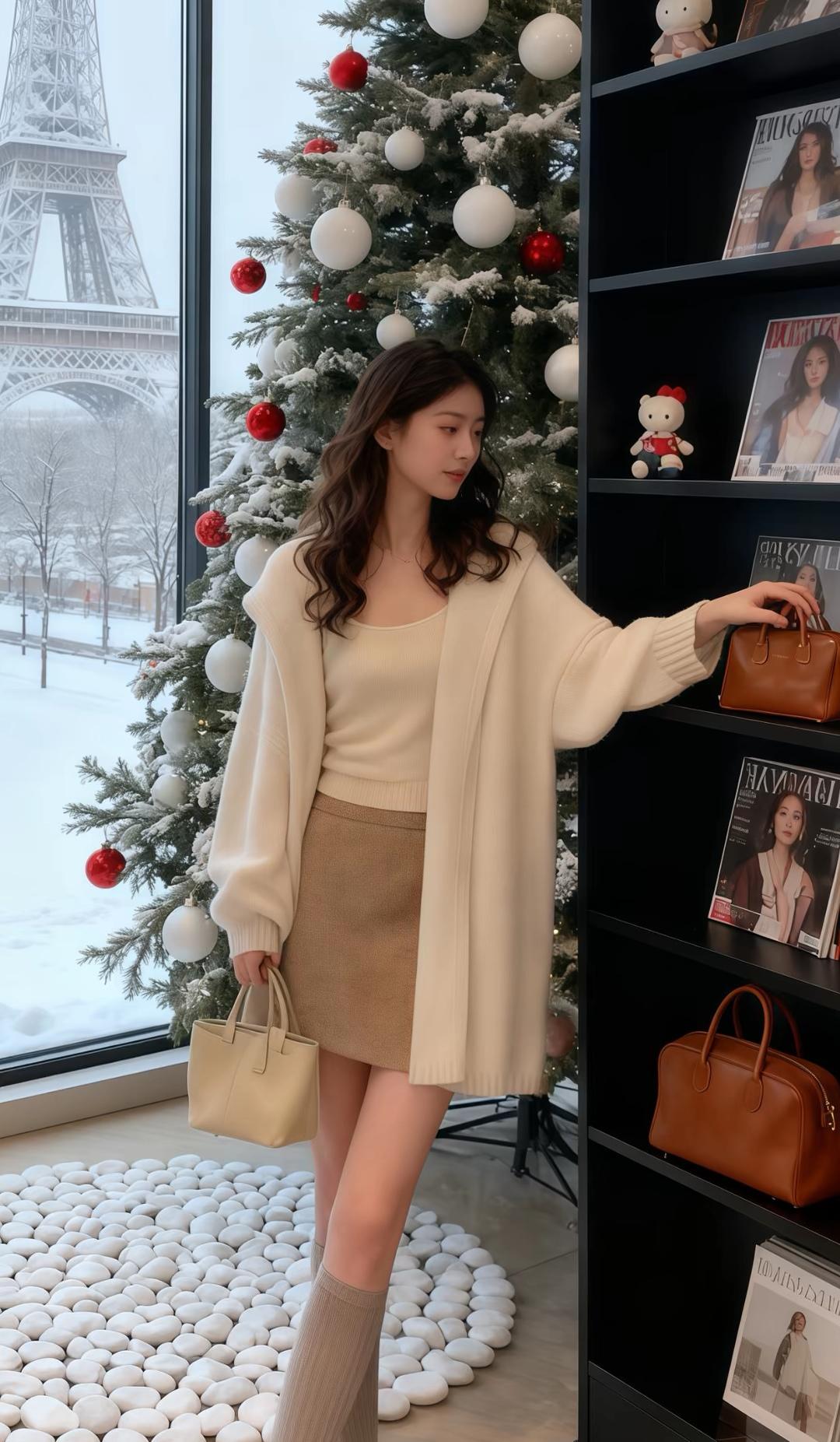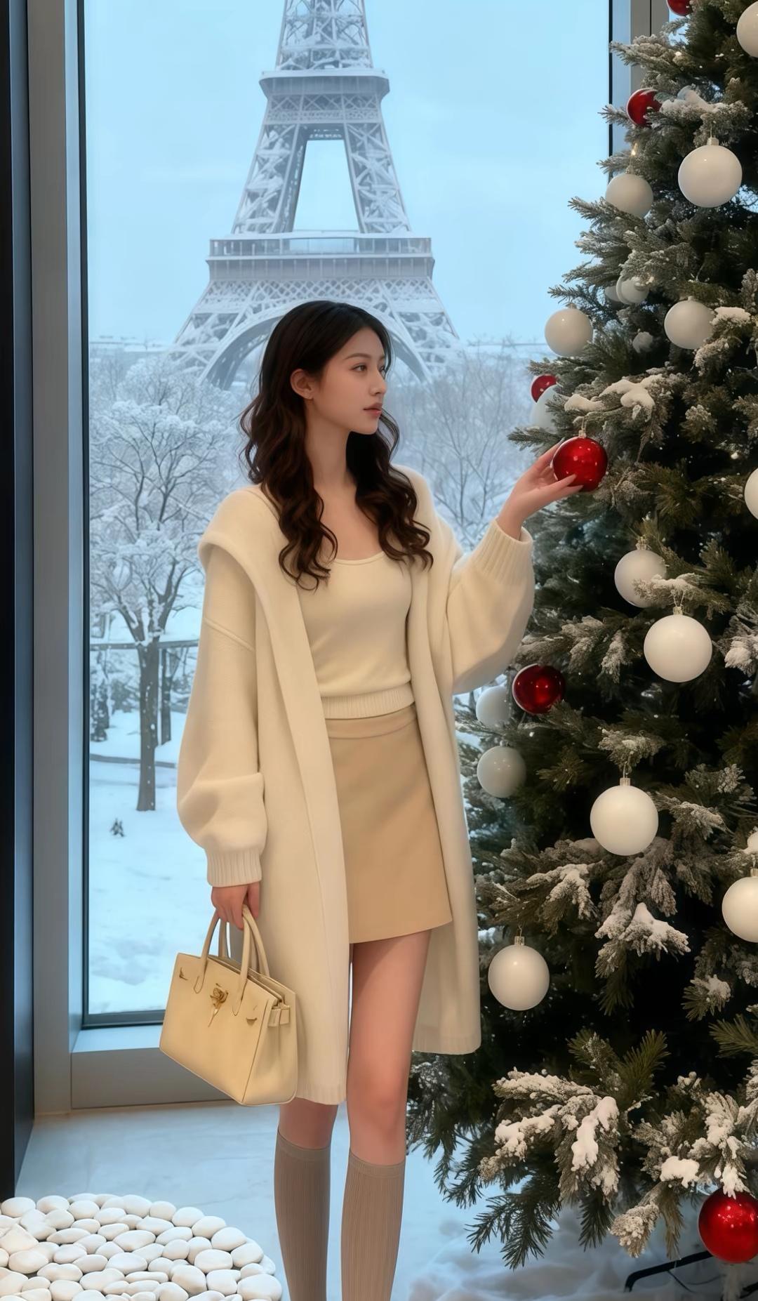 冬日雪景中的圣诞树,搭配米色大衣和长靴,温暖又时尚。