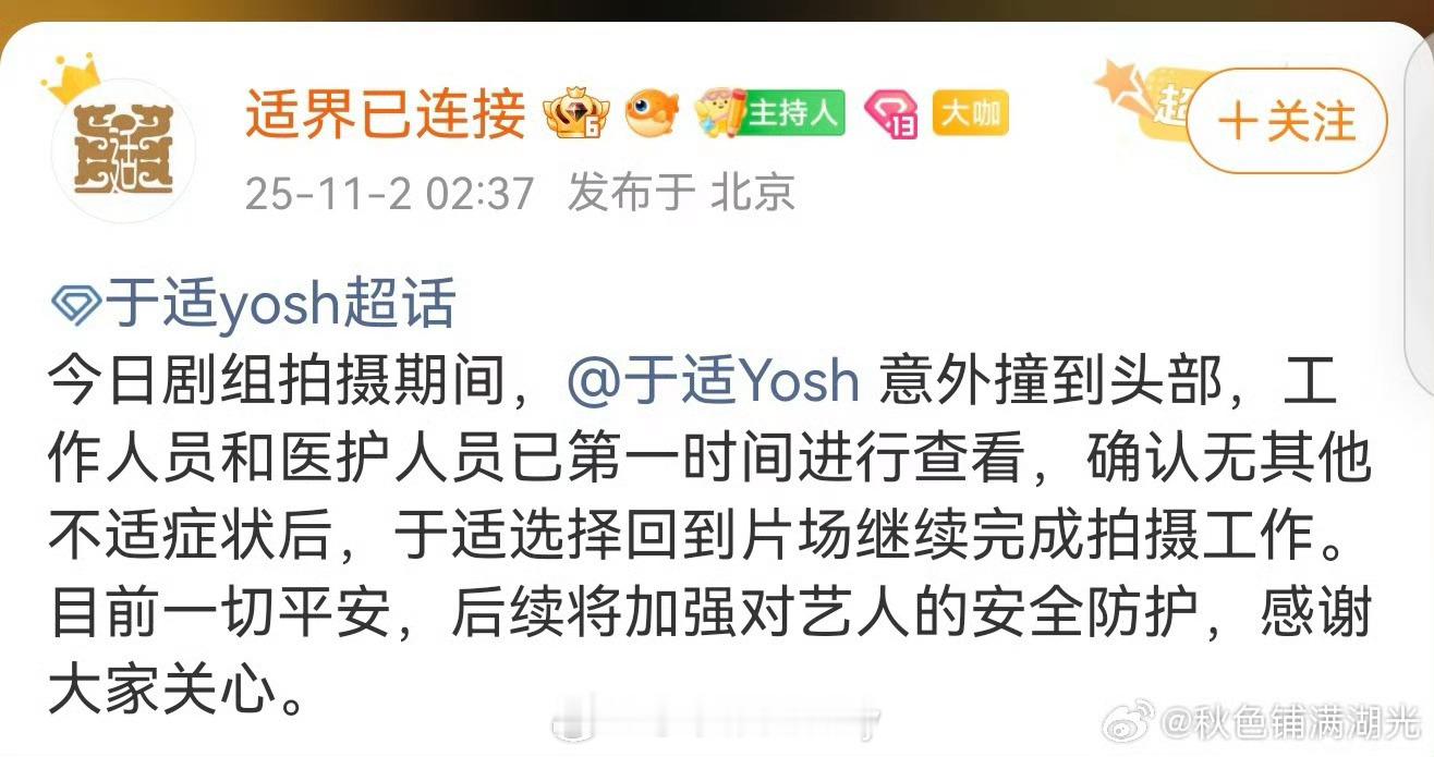 于适方回应撞到头部: 工作人员和医护人员第一时间查看,确认无不适症状,目前一切平安[抱抱][抱抱]