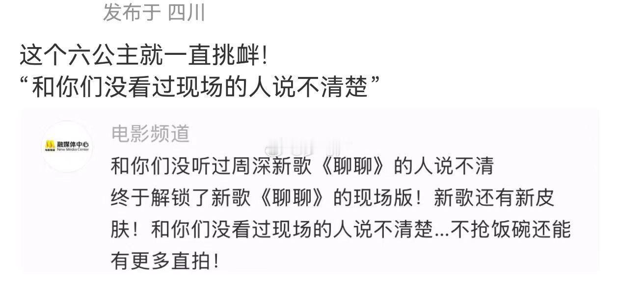 六公主说和没看周深现场的说不清 从新歌首唱到经典重现,六公主用直拍建起周深音乐博物馆。那句“不抢饭碗”的潜台词怕是:我拍我的,你们羡慕你们的!