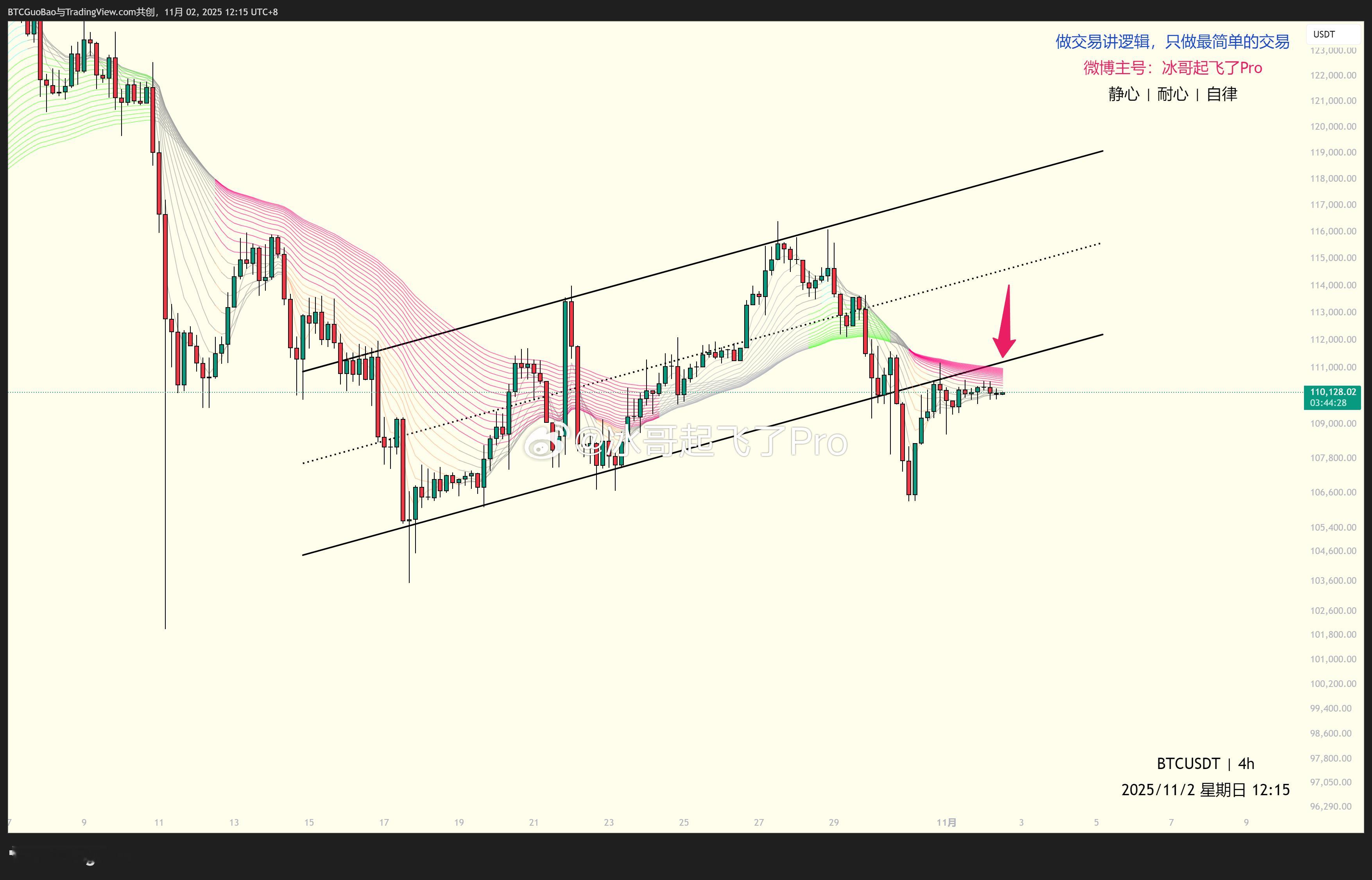 大饼处于跌破牛旗反抽到下边线,这里是个阻力位置,没过去就代表下跌趋势还在,过去的话就是下跌趋势结束,保持在下方的话哪么就是震荡下跌行情为主,除非站上去!