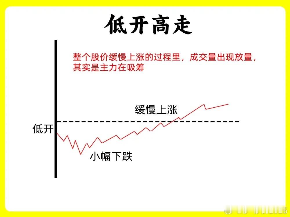股价早盘低开往往是比较弱势的表现。在分时图里,股价出现早盘低开,随后继续小幅下跌,这种主力故意打压股价。随后股价开始缓慢上涨,突破开盘价,突破0轴,创出新高。整个股价缓慢上涨的过程里,成交量出现放量,其实是主力在吸筹