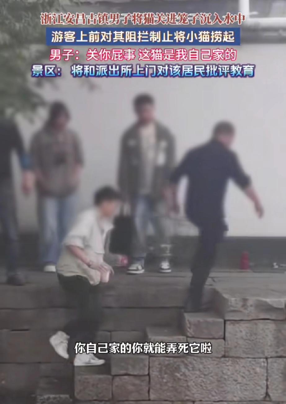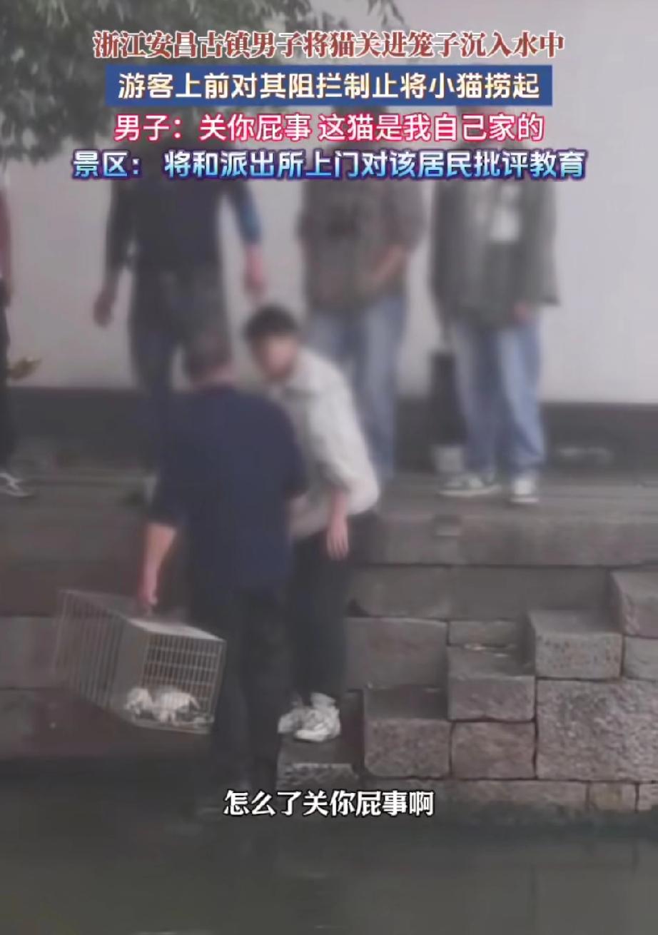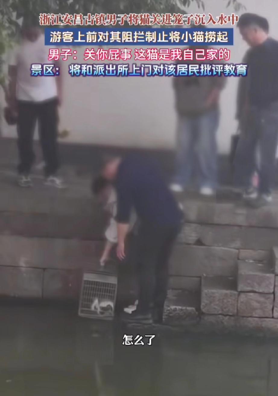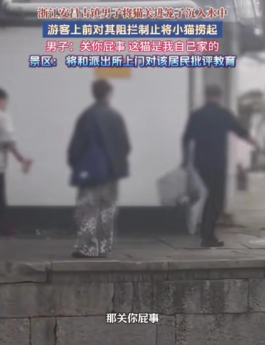 浙江安吉,有个中年男子将一只猫咪关进铁笼,随后沉入河中。猫咪在水里奋力挣扎,水面