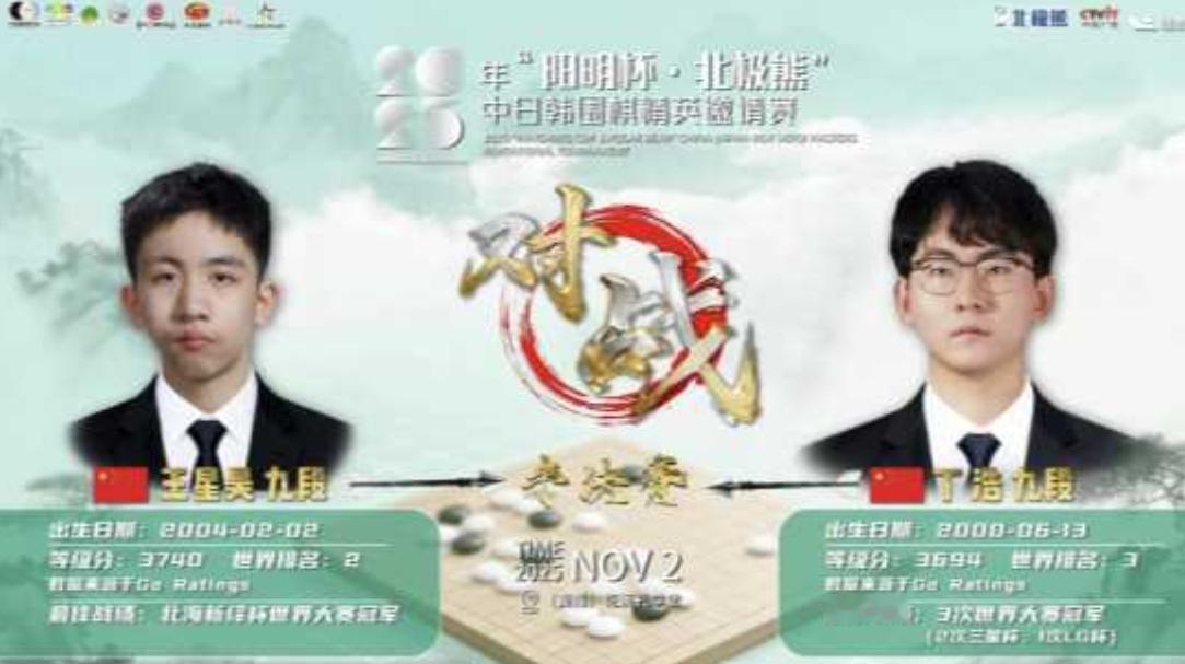 零零后提前争冠 差八岁老少对决 阳明杯半决赛一览 2025首届贵阳《阳明杯·北极熊》中日韩三国围棋精英赛10月31日至11月3日在贵阳孔学堂举行。 来自中国8位棋手丁浩、王星昊、杨楷文、唐韦星、范廷钰、李维清、许嘉阳、屠晓宇。韩国4位棋手朴廷桓、姜东润、申旻埈、李志贤。日本4位棋手井山裕太、余正麒、大竹优、广濑优一。16位中日韩职业顶尖棋手汇聚孔学堂进行4天4轮的角逐,争夺本届冠军及40万元奖金。 16强战中国7人韩国1人晋级,8强战范廷钰淘汰了韩国独闯八强的朴廷桓,中国范廷钰、丁浩、王星昊、屠晓宇包揽四强。 半决赛,被称为死亡半区的两位世界冠军丁浩对阵王星昊,赛前夺冠呼声最高的两位00后于半决赛狭路相逢,提前争冠的一场巅峰对决。 猜先王星昊执黑棋先行,序盘右下角黑棋33、35过缓,不足70手几个黑子被迫弃掉,胜率跌至5%左右。之后的丁浩越战越勇,牢牢把控局面,黑棋几乎无机可乘,胜率居高不下,黑棋几经求战,但几乎无机可乘,丁浩获胜,再显冬日战神之威,随后晋级与屠晓宇会师决赛。 另一盘半决赛,淘汰了韩国第二朴廷桓的96后范廷钰九段对阵04后未来之星的屠晓宇九段,一场相差8岁的老少对决争夺决赛权。 老板执黑的63、65以下过强,遭到白反击后至8O手胜率跌至7%,已处劣势的黑棋右上强行切断白棋,白棋利用厚势,消劫取得连络后继续保持优势,黑反扑无果,屠晓宇领先6·5目获胜,率先晋级决赛。 11月3日丁浩/屠晓宇决赛争冠。
