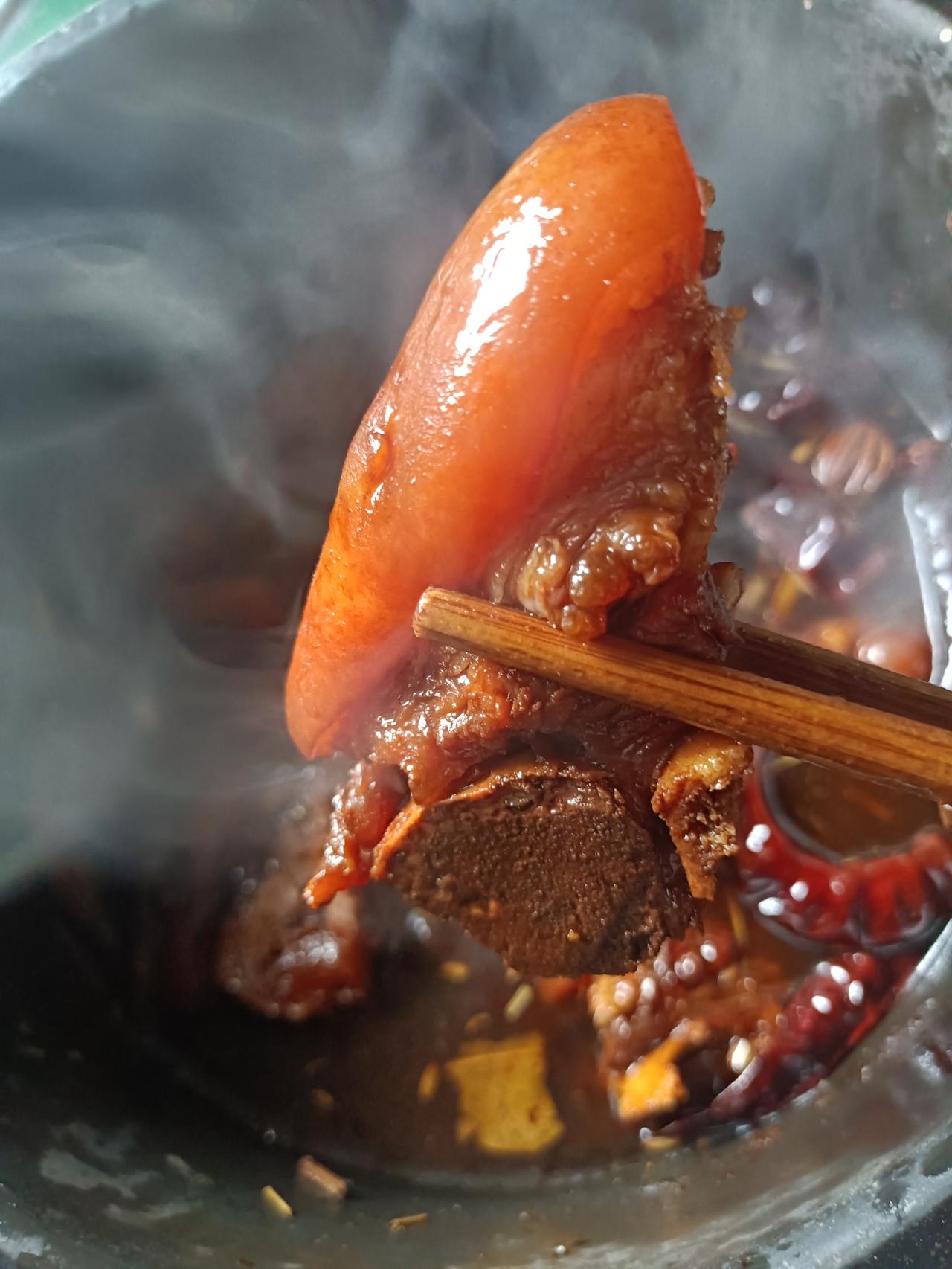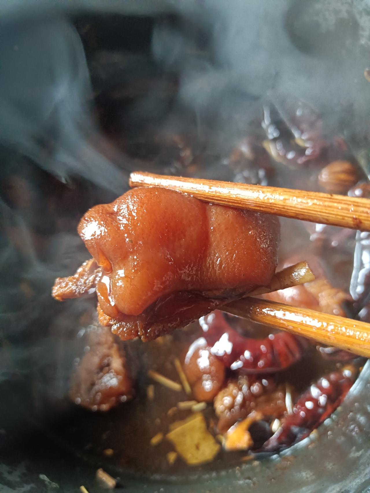 民以食为天,食品安全牵动人心,昨天这里曝雷,今天那里爆雷。 矫枉过正的人们都不太敢出外寻食了,特别怕添加了不能食用的化学品。 今天去菜市买了一只脚蹄,起锅,烧油,放入白糖炒起泡沫(白糖炒化),倒入已加好水的卤锅,加适量盐,加一包″二姐"卤料,喜欢麻、辣味的,可以加入适量的干花椒和干辣椒,大火烧开,改小火慢炖大概两小时。 猪蹄一点点的变红,这是没有任何色素添加的卤味,看看这颜色,够不够正? 超级简单,友友们学到了吗? 万能生活指南