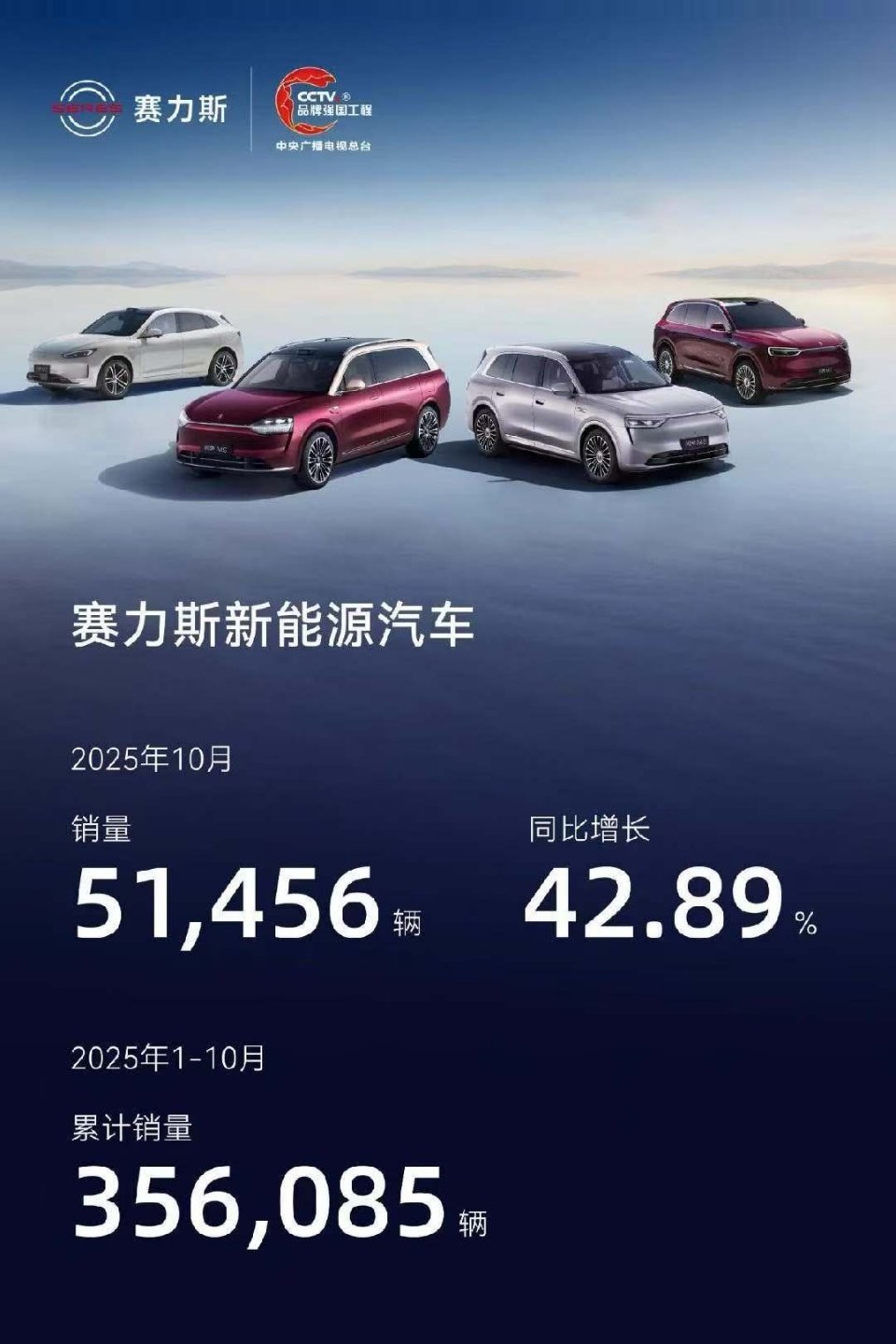 赛力斯新能源汽车10月销量51,456辆,同比增长42.89%,创历史新高