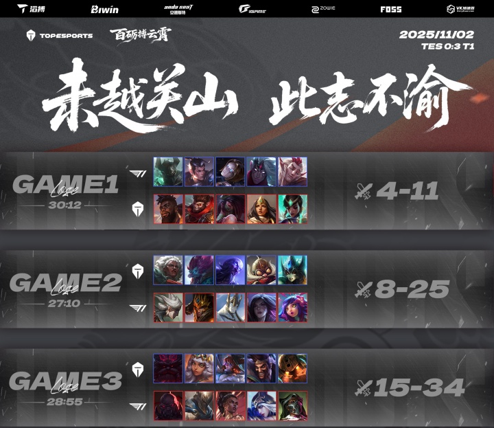 直播吧11月2日讯 2025英雄联盟全球总决赛半决赛TESvsT1第三局,T1以3比0战胜TES晋级决赛,赛后中国台湾论坛网友也对此事议论纷纷。