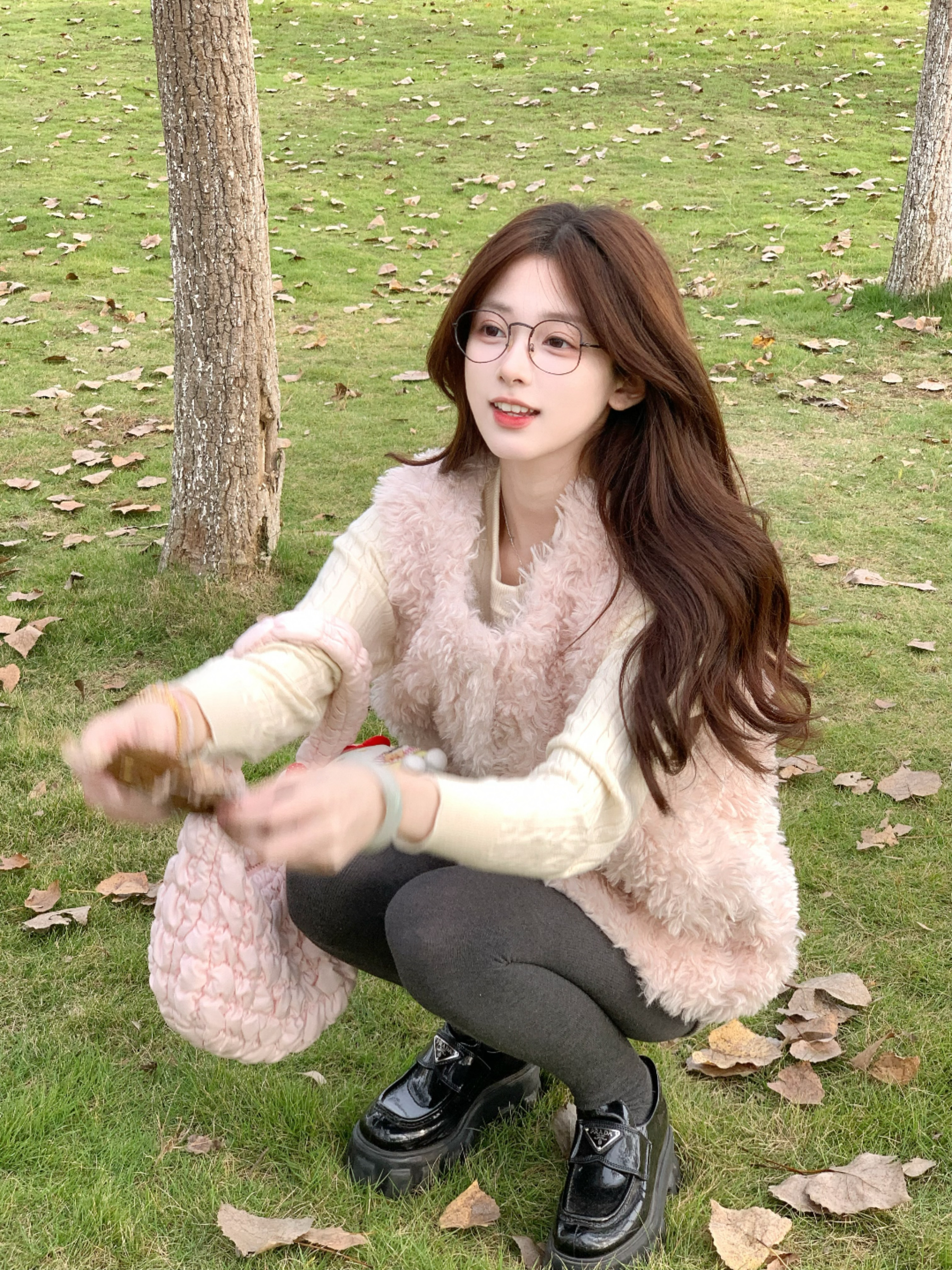 街头偶遇一位女士,米白交叉针织衫配浅蓝牛仔裤,脚踩米色高筒靴,简约又时尚,尽显都