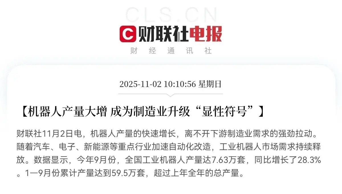 财联社弹出了一个重大利好消息,今年9月份,全国工业机器人产量达7.63万套,同比增长了28.3%,1-9月份累计产量达到59.5万套,超过了上年全年的总产量,机器人的产量正在迎来爆发式的大增长,它已经成为新经济不可忽视的重要力量,机器人相关核心公司正慢慢的从投资端走向盈利端了,机器人产业将会成为未来十年最具潜力,最具价值的投资机遇,机器人板块已经调整了一年左右的时间了,已经接近尾声了,做好心理准备,预计机器人板块又要重回大科技的主线了,值得期待!