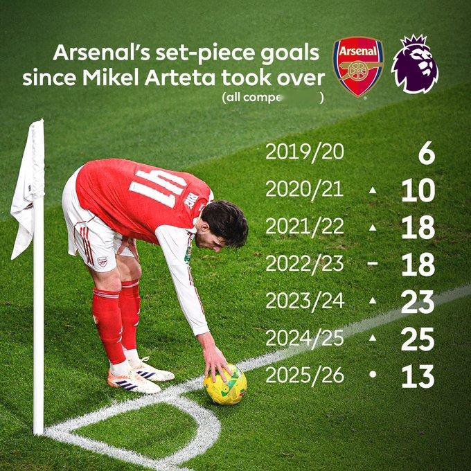 阿森纳有望再次刷新上赛季的定位球进球纪录