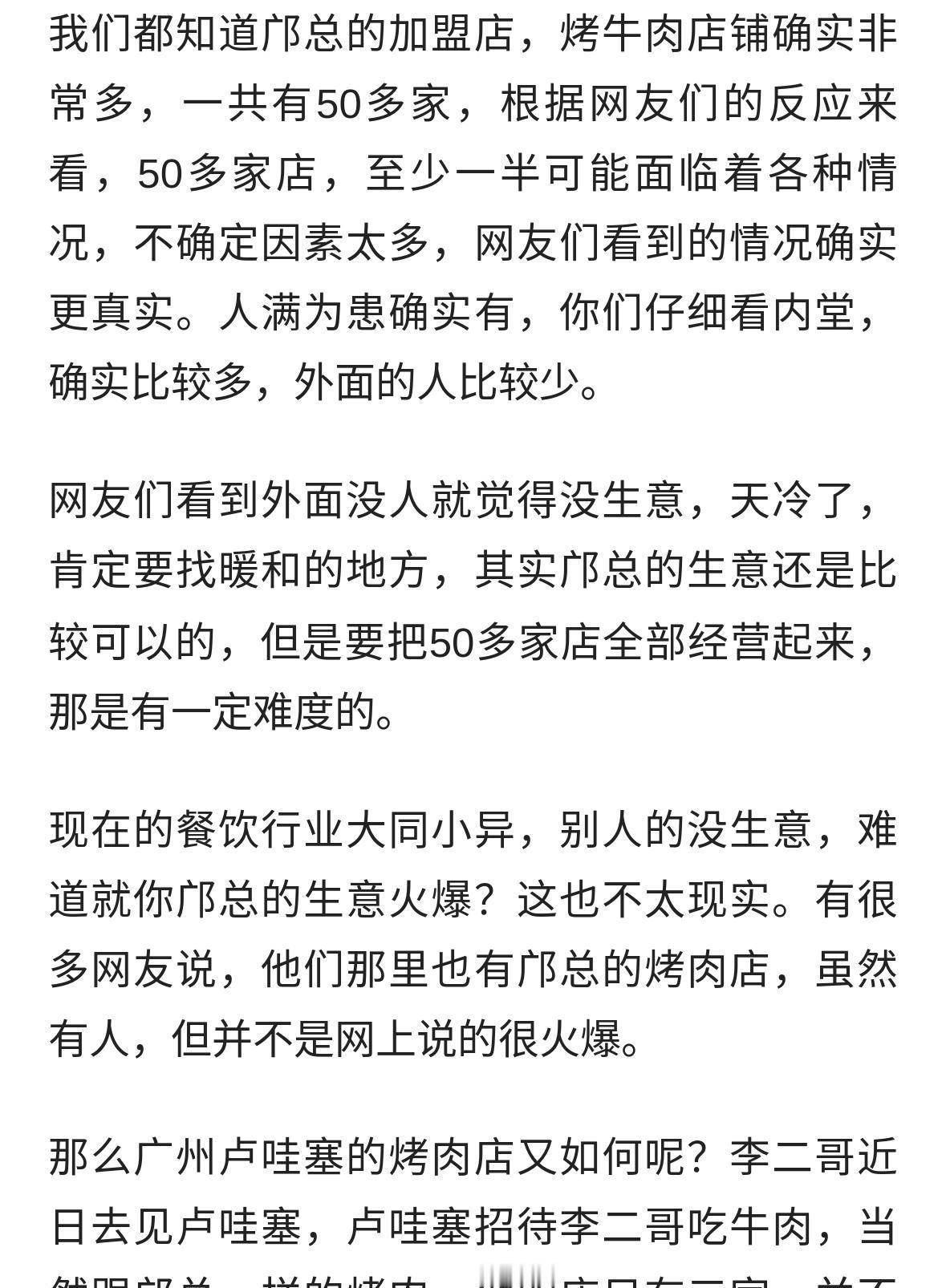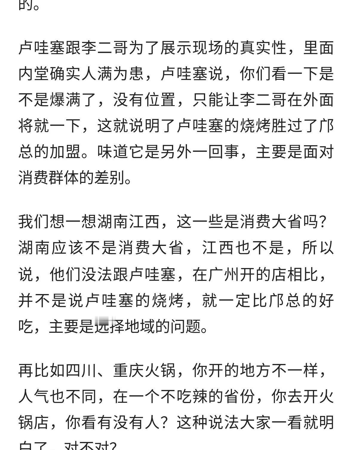 邝总的店铺遍地开花,但每家都像在打游击。 卢哇塞在广州街头,排队能排到下一条街。 不是烧烤不好吃,是地方不给劲。 一线城市夜宵人潮汹涌,二三线还在等顾客进门。 加盟店跑得快,但味道跑偏了没人管。 直营店稳得住,一口下去就知道为什么回头客多。 广州人不吃虚的,认的是烟火气和热锅气。 你不把店开在人堆里,再好的配方也凉透了。 别迷信扩张,先搞懂谁在吃你家烧烤。 年轻人不为品牌买单,只为那一口真香心动。 管得好,加盟店也能成爆款。 管不好,直营店也熬不过冬天。