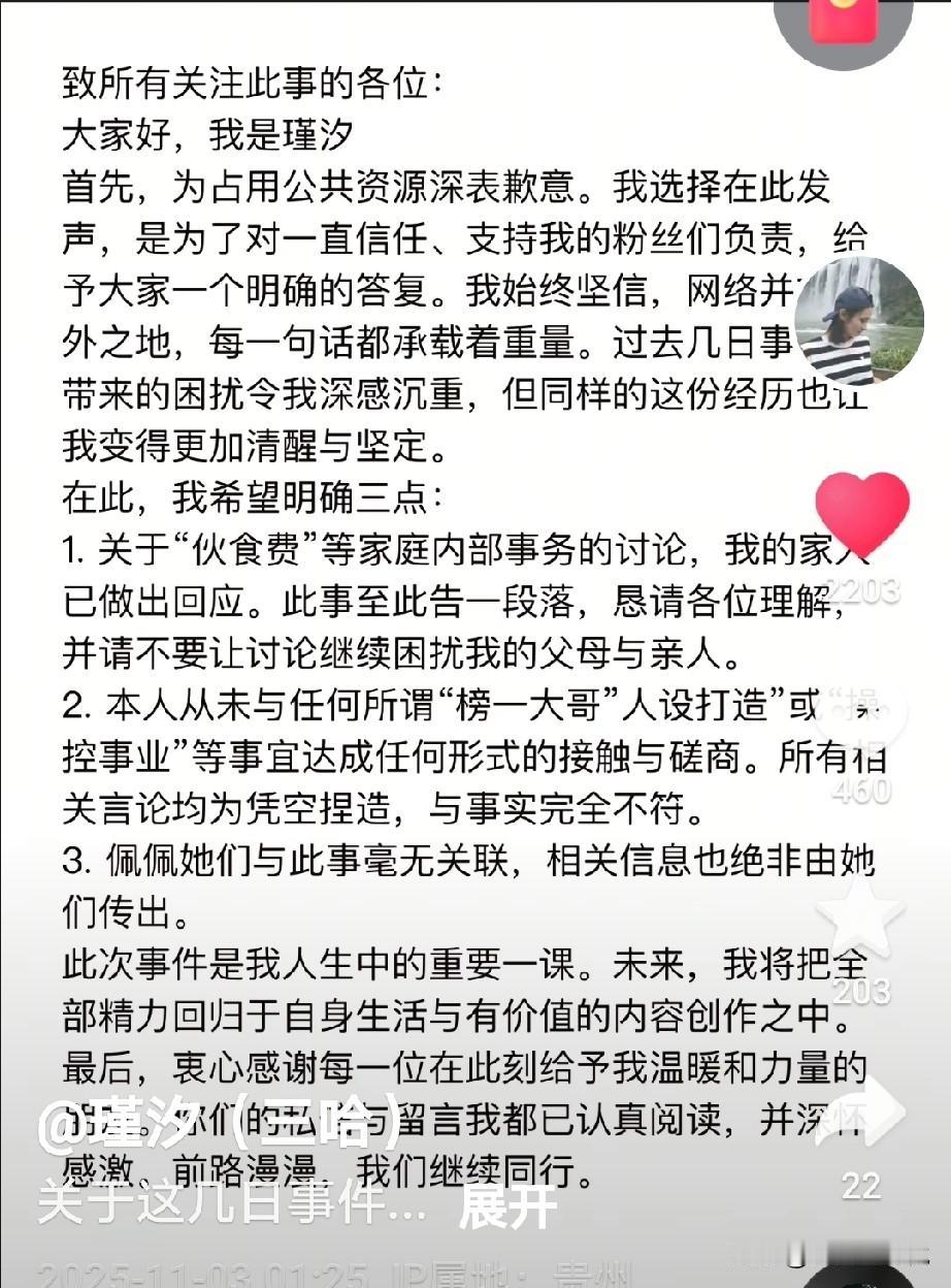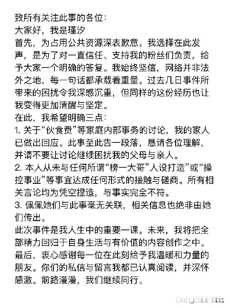 瑾汐终于出来正面发声了, 但是没有说明事情到底是怎么回事? 她只说关于搭伙费的问题,那是家庭内部问题,她的家人已经出来澄清了,事情已经告落一段了,希望大家不要去打扰她的爸爸妈妈,以及她的家人, 还有关于榜一大哥的问题,那都是无中生有,根本没有那么回事, 至于佩佩的问题,整件事都和她无关。 瑾汐只说了这些,没有说的太多, 感觉并没有强调什么, 也有网友猜测这迟到的发声是被二哈逼出来的, 但是有一点搭伙费5万已经成了一个事实,瑾汐在文中说过。[呲牙]