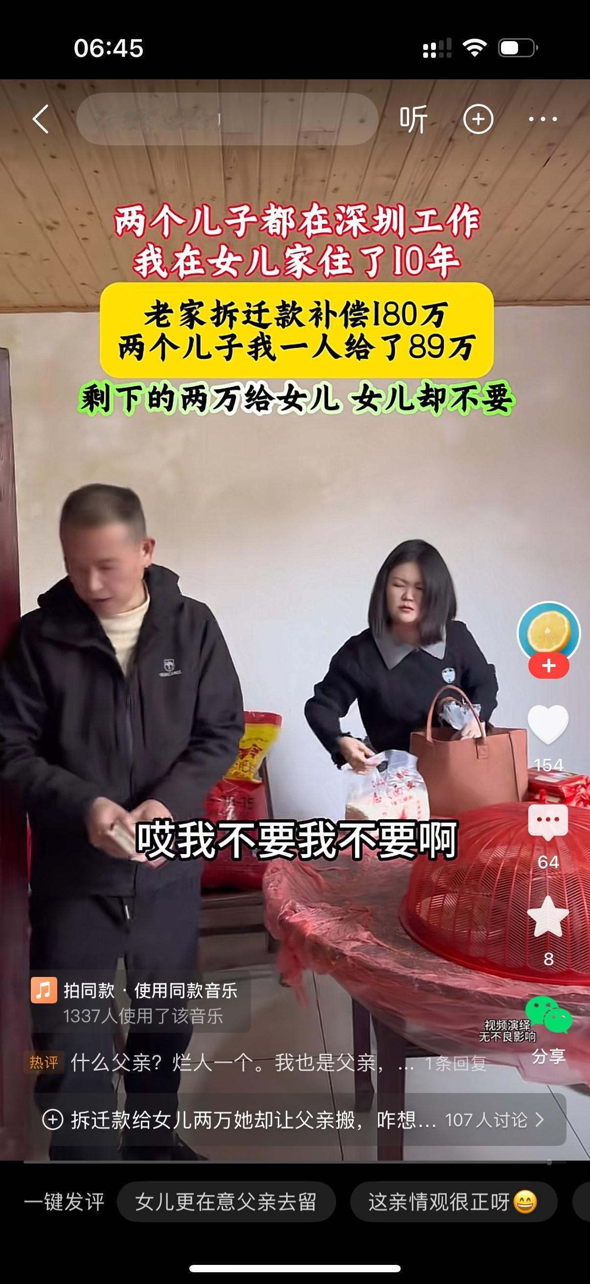 男人一直在女儿家养老,住了十年。老家房屋拆迁,男人拿到180万拆迁补偿费。男人给了两个在深圳工作的儿子一人89万。剩下的2万,男人拿去给女儿,说家里拆迁,这里还有2万钱给你哦。女儿却拒绝,摆手说我不要我不要。男人知道女儿是生气了,嫌自己给的太少。他打包好行李,带着剩下的2万去深圳找儿子去了。