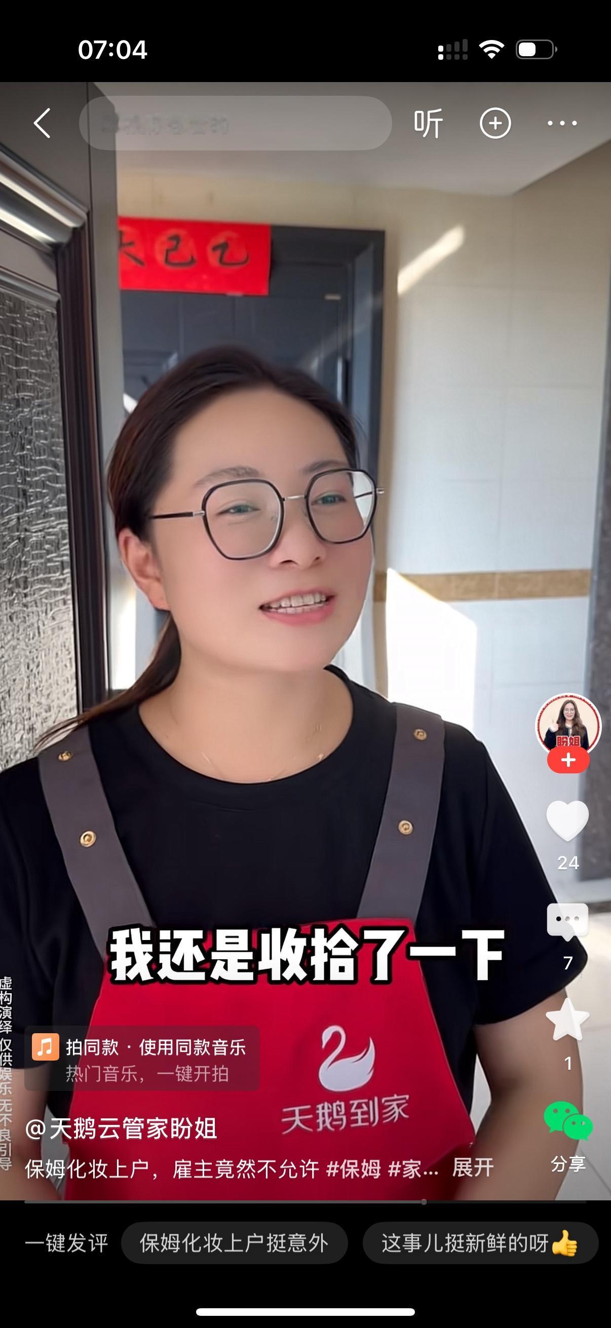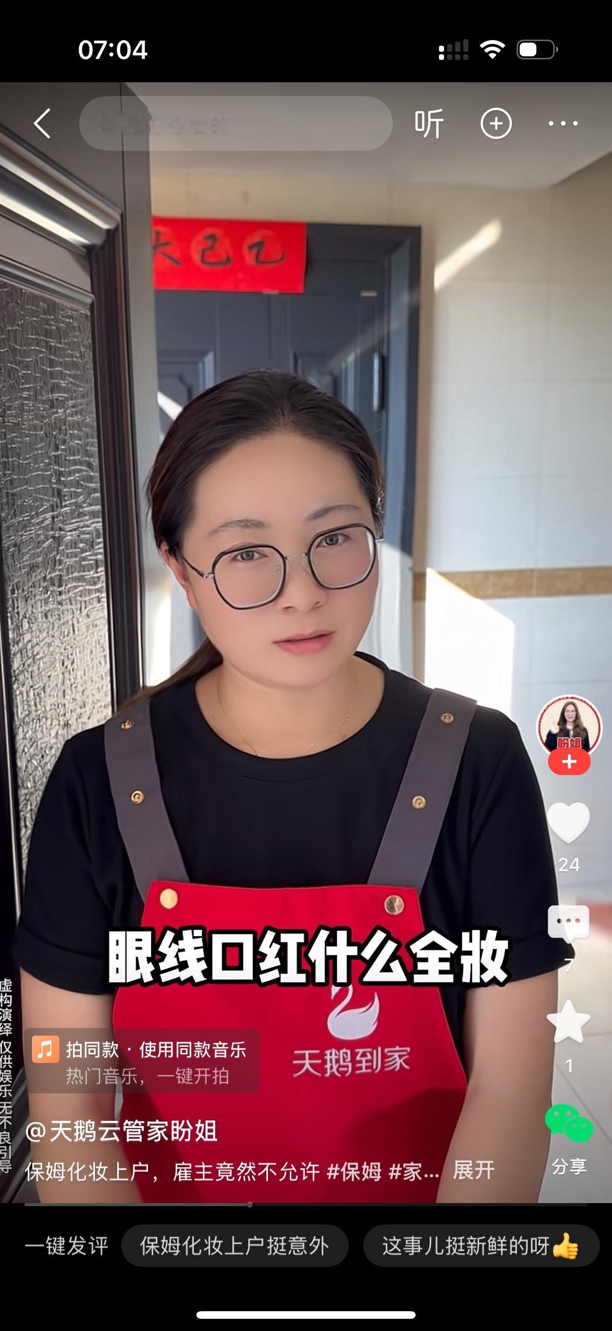 保姆第一天去新雇主家上户。雇主看到她浓妆艳抹,就说你眼线口红什么全妆,带妆上班啊?保姆说第一天上班,为了表示尊重,我画了一下妆。雇主说,你是要带宝宝的,你这样很不好。我家不需要你,你下户吧。保姆还想解释一下,雇主已经把门关上了。