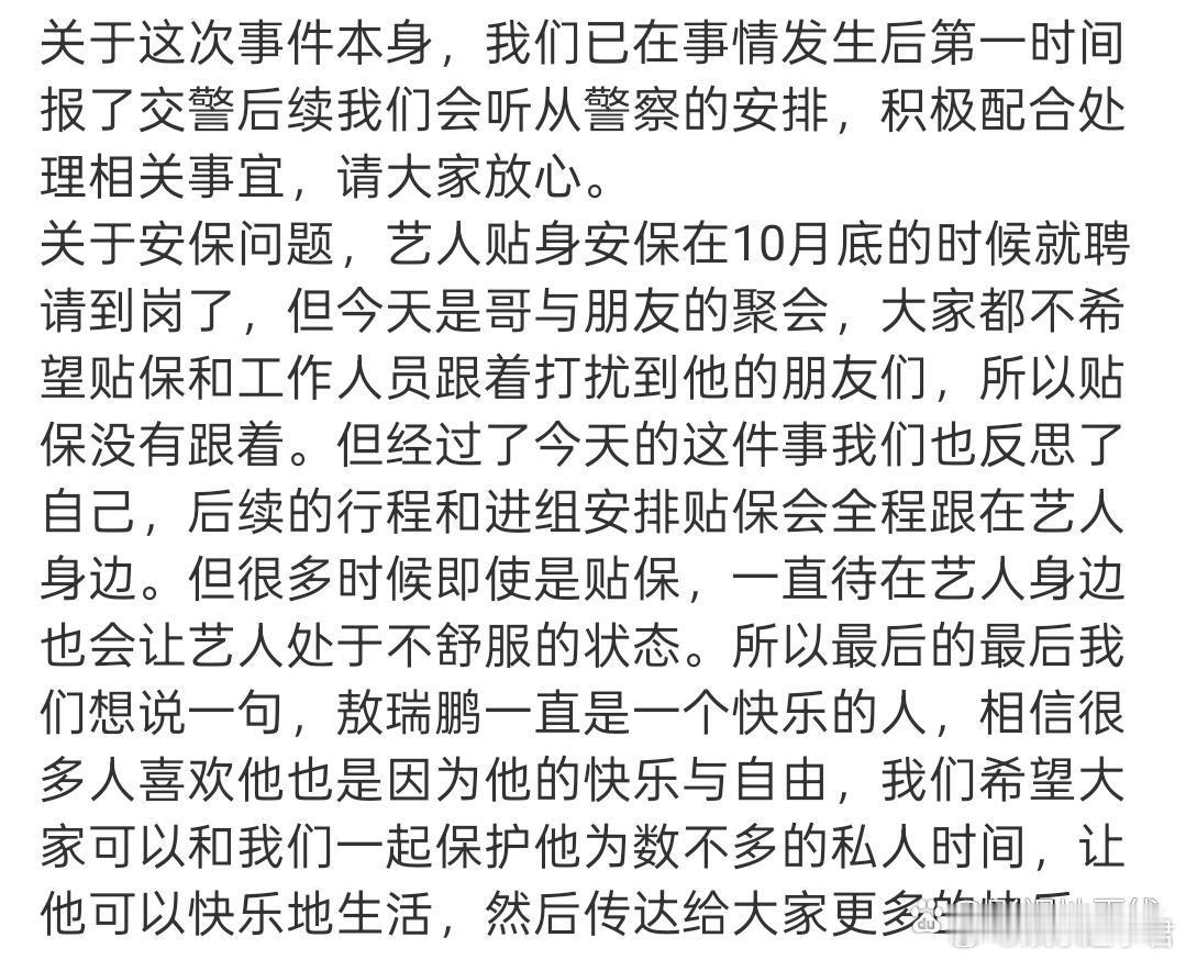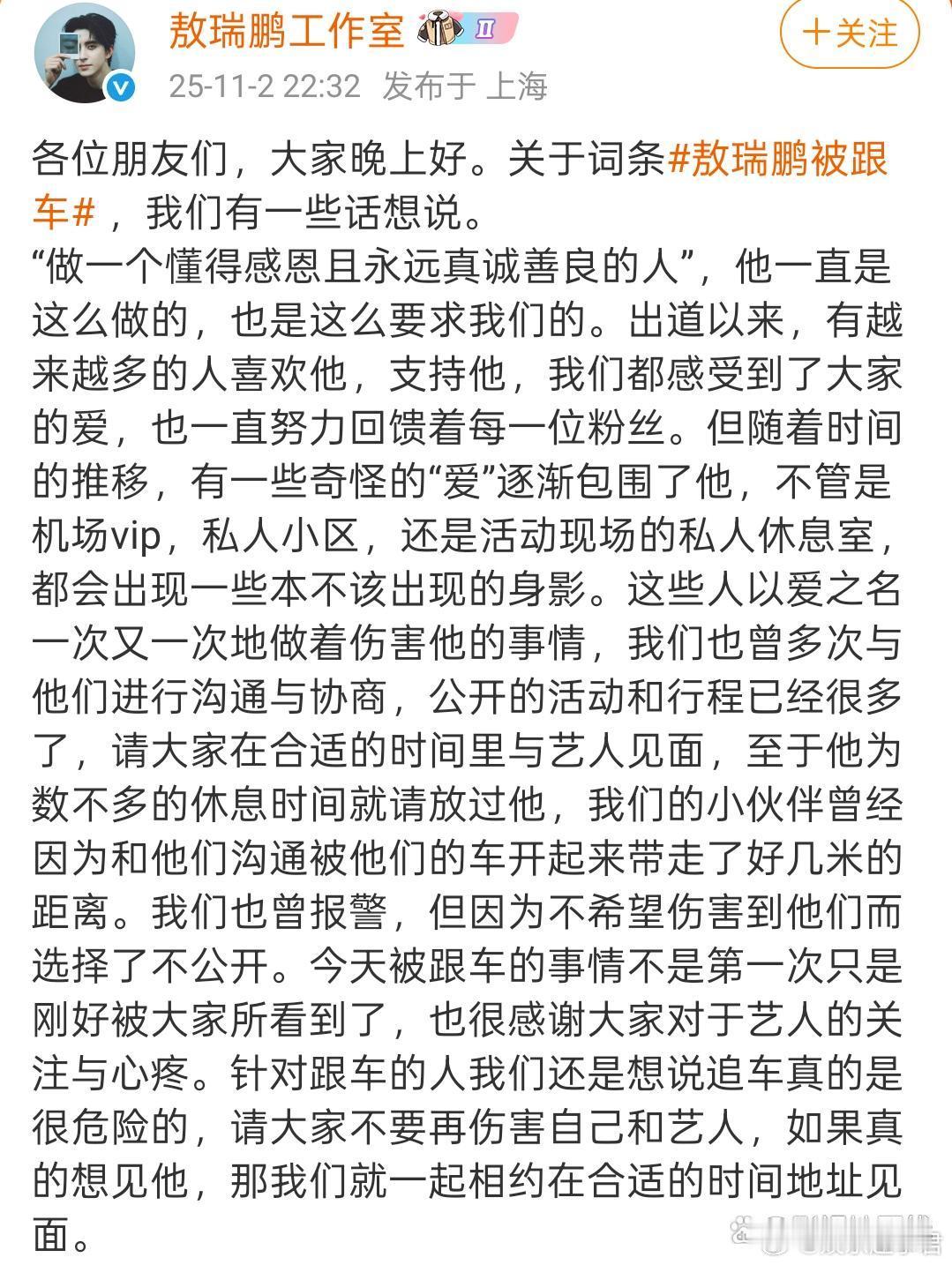 敖瑞鹏工作室报警11月2日,有网友晒敖瑞鹏被跟车视频,引发热议。敖瑞鹏工作室发文回应,称今天被跟车的事情不是第一次,已经报警,也已经安排艺人贴身安保,但今天是与朋友的聚会,所以贴保没有跟着。“希望大家可以和我们一起保护他为数不多的私人时间。”