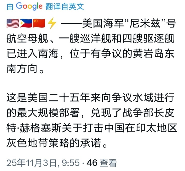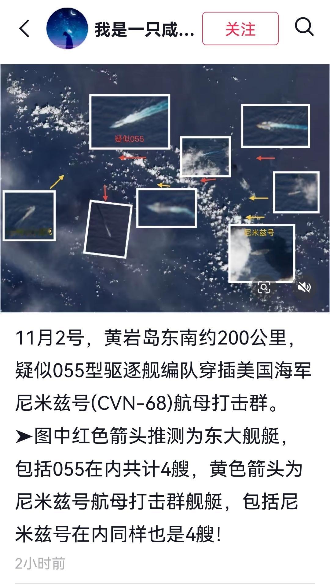 在外网上看到说美国海军“尼米兹”号航母编队进入南海,位于黄岩岛东南方向。刚才又在DY上刷到有人发卫星图片称我海军055编队在黄岩岛附近海域穿插了“尼米兹”号航母编队,不知真的假的。