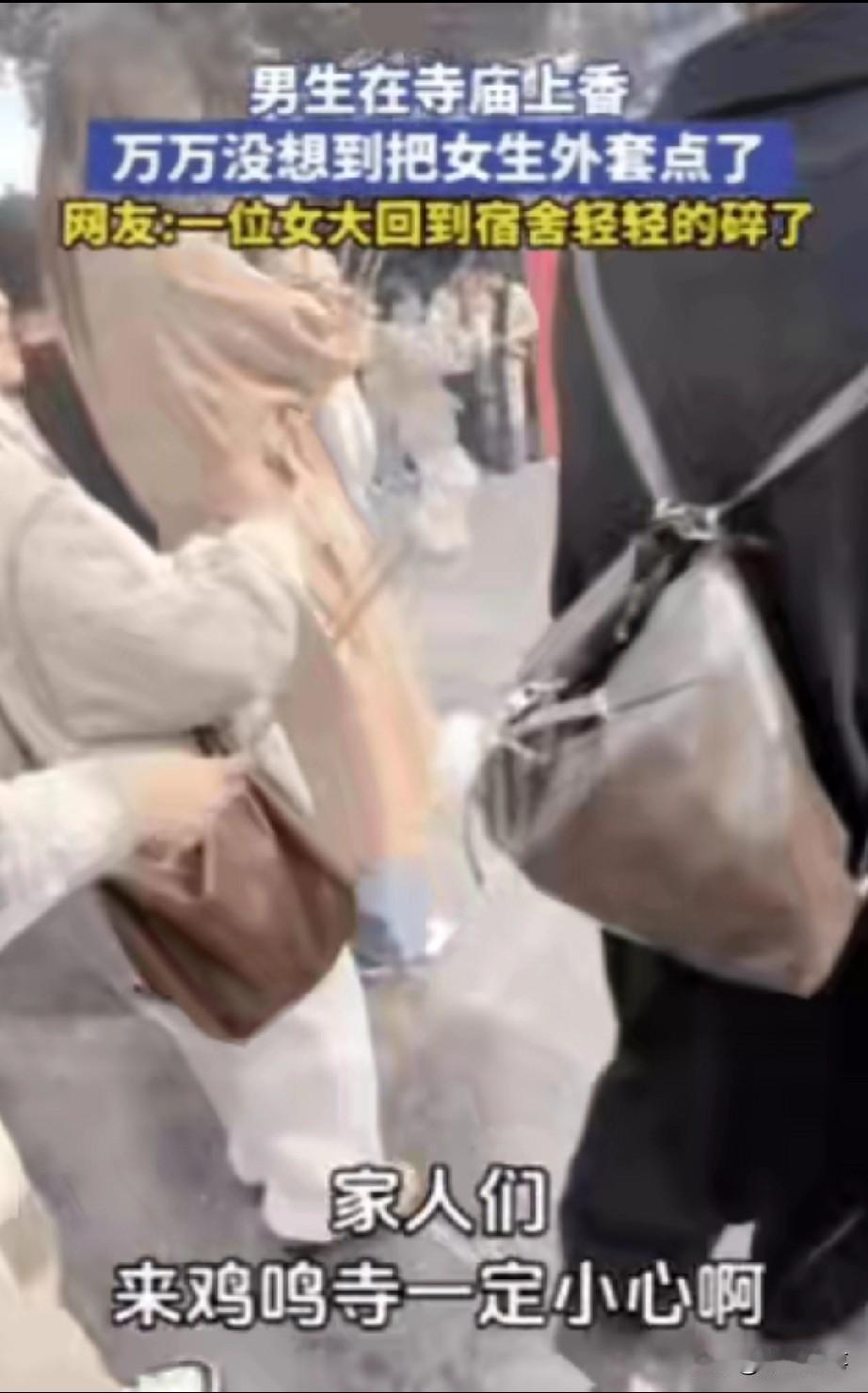 江苏一男生去寺庙求姻缘,点上香低头要祭拜,身旁穿白色毛呢外套的人刚挪了一步,后肩胛骨正好凑到香头前。“滋啦”一声,衣服上烫出个黑焦小洞,还冒起青烟,男生赶紧甩开香,脸涨得通红,一个劲道歉。 幸亏天凉穿得厚,没伤到皮肤。被烫的人没生气,看着对方手足无措的样子,摆摆手说“没事”就没再追究。巧的是,两人都是来求姻缘的,香火最旺的殿外遇上,本该是“千里姻缘一线牵”,没想到牵线的是带火星的香头。 事后男生特别后悔,当时光忙着道歉,压根没想起要联系方式。网友调侃,这明明是送上门的缘分,也是主动买新外套弥补的机会,偏偏没把握住。这场意外小插曲里,包容比刻意安排的邂逅更暖,缘分有时候就是这么猝不及防。