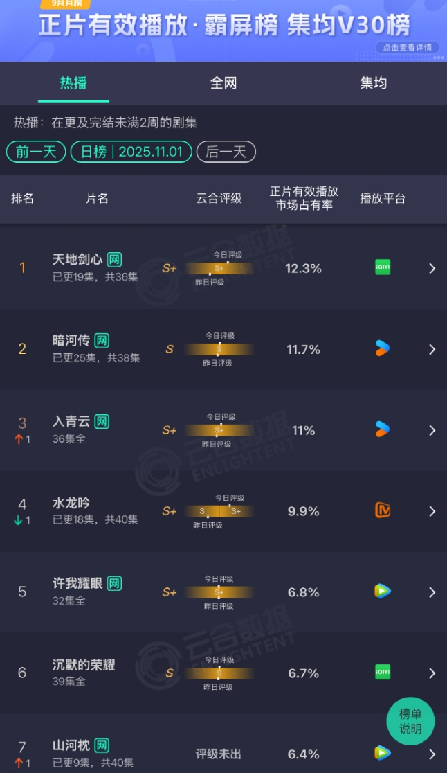 成毅的《天地剑心》2300万播放,龚俊的《暗河传》2200万播放,侯明昊收官的《入青云》2100万播放,罗云熙《水龙吟》1800万播放,宋茜丁禹兮《山河枕》1200万播放。