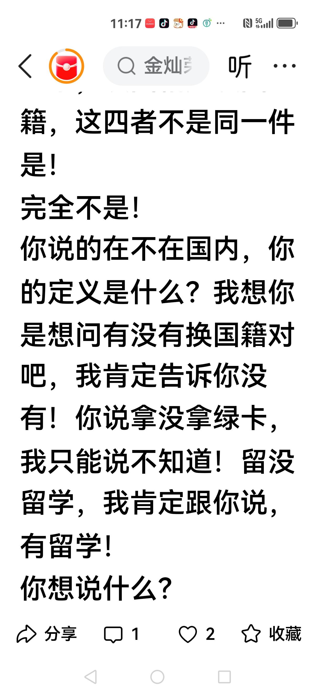 【尴尬到了极点】 出国有多种方式,比如旅游几天,出国留学几年,有的拿到绿卡,当然也有申请到国籍。 加入美国籍,外人无法知道的,你查不出来了,只有他退出美国籍,有一个退出后交税公示,你才能知道退出美国籍。 针对这几种,有记者很刁钻问两位大师:你们孩子有没有入美国籍或者拿绿卡? 大师回复堪称经典: 你说的意思是不是在国内?你的定义是什么? 你想问有没有加入美国籍?我告诉你没有。 有没有拿到绿卡,只能说不知道。 留没留学?肯定告诉你留学。 汉语丰富多彩,博大精深,被他们发挥到极致。