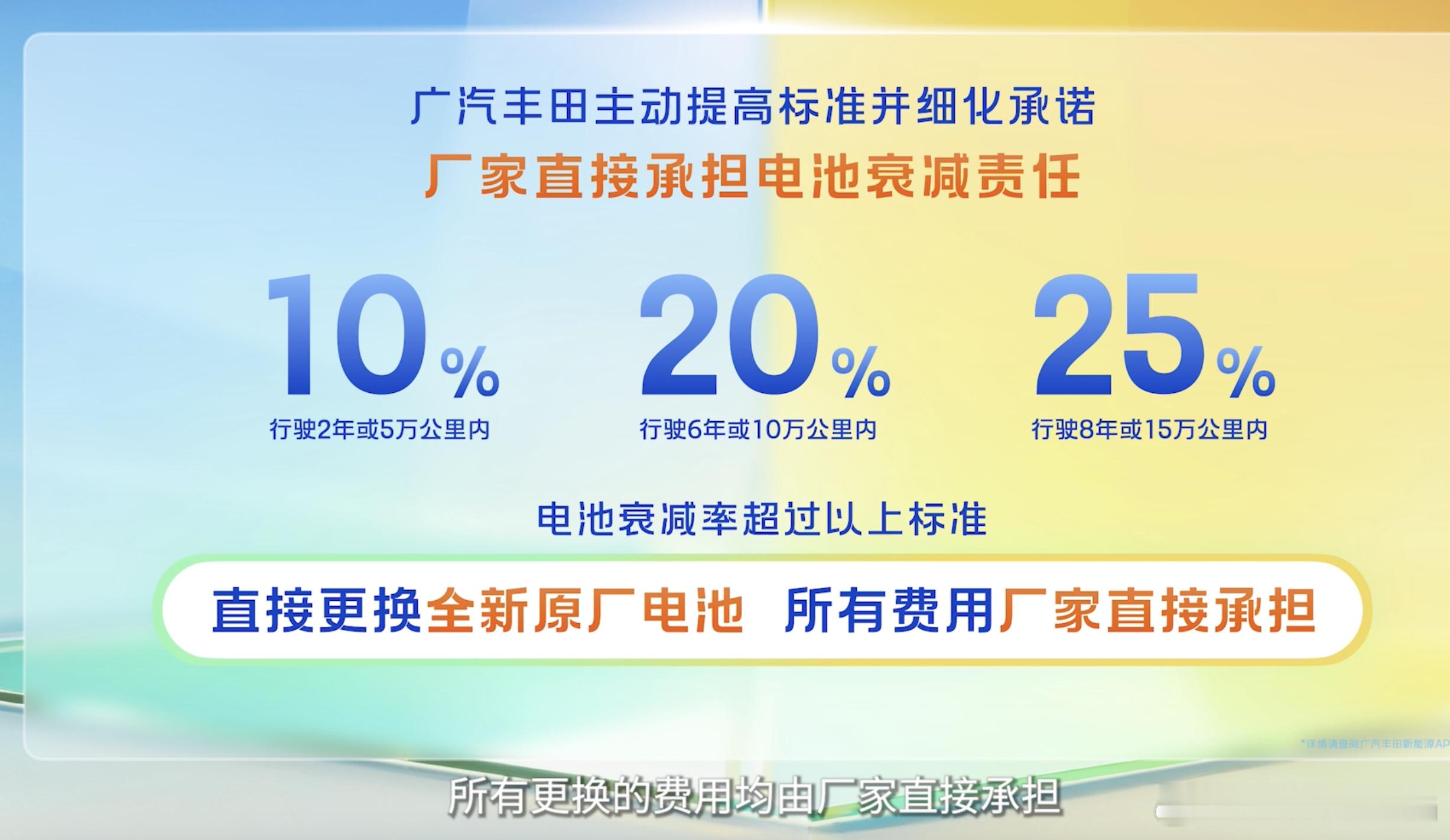 但是政策是否完美落地,还是有客户疑虑哈,所以这次广汽丰田持续推出细节和新的担保,除了自燃和泊车,这次还把损耗率也做了保障,也就是你快充多了,担心损耗这次丰田也担保了,从双担保升级到三担保。