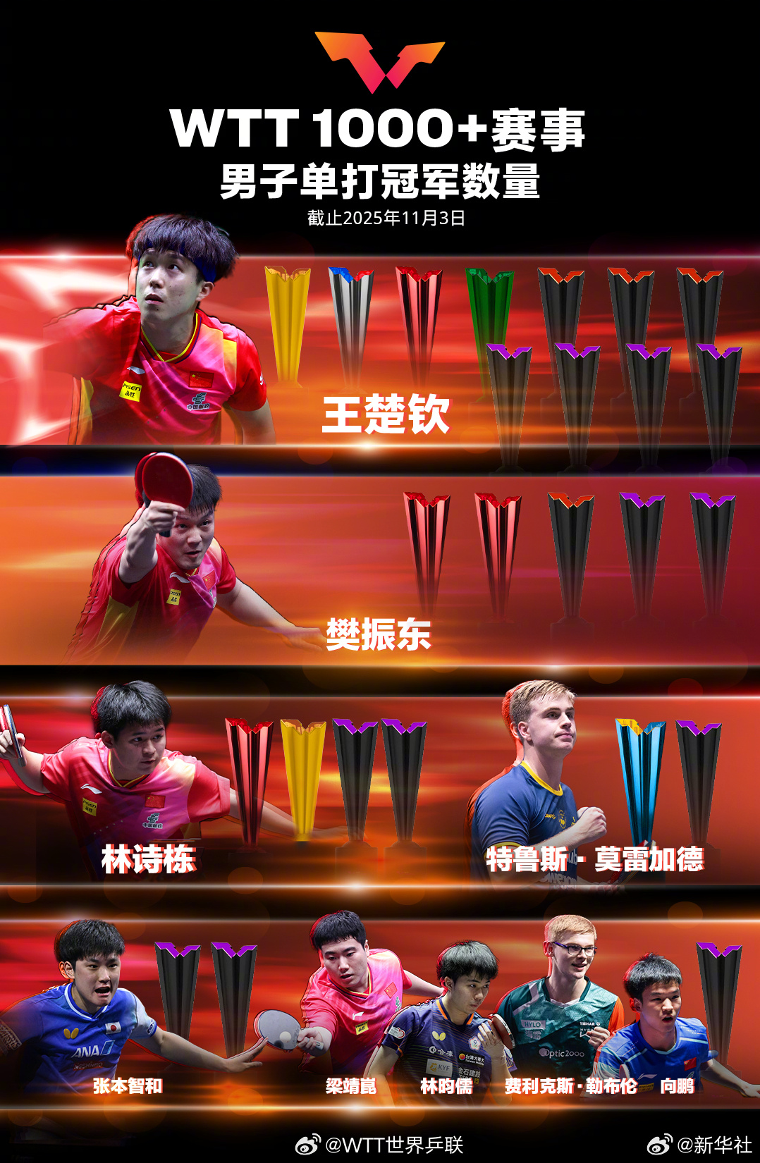 【祝贺!#WTT1000+冠军榜孙颖莎王楚钦继续领跑#】今天,更新WTT1000+冠军榜。14座冠军奖杯领跑女单榜单,11座冠军奖杯领跑男单榜单。继续为国乒加油!