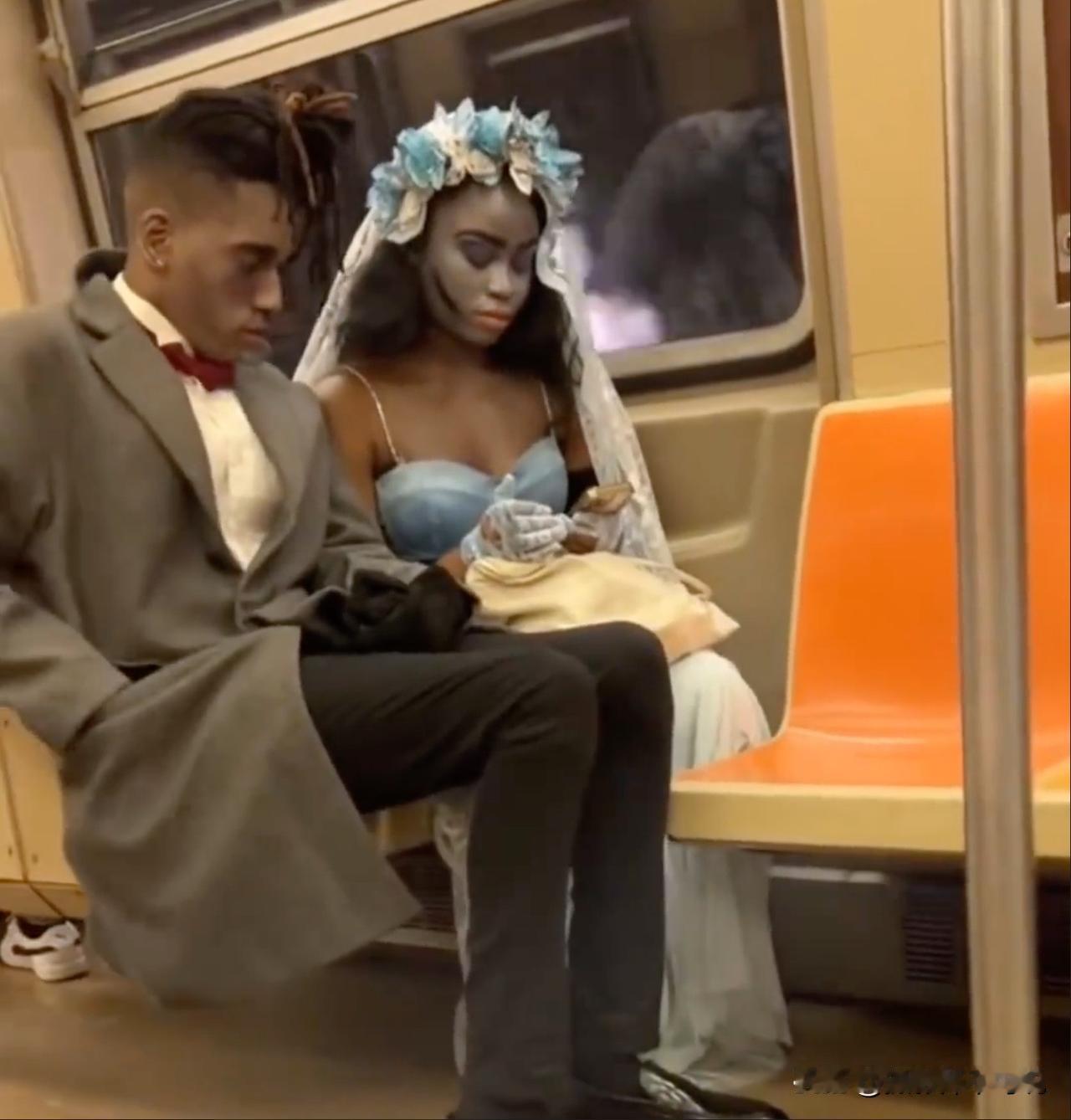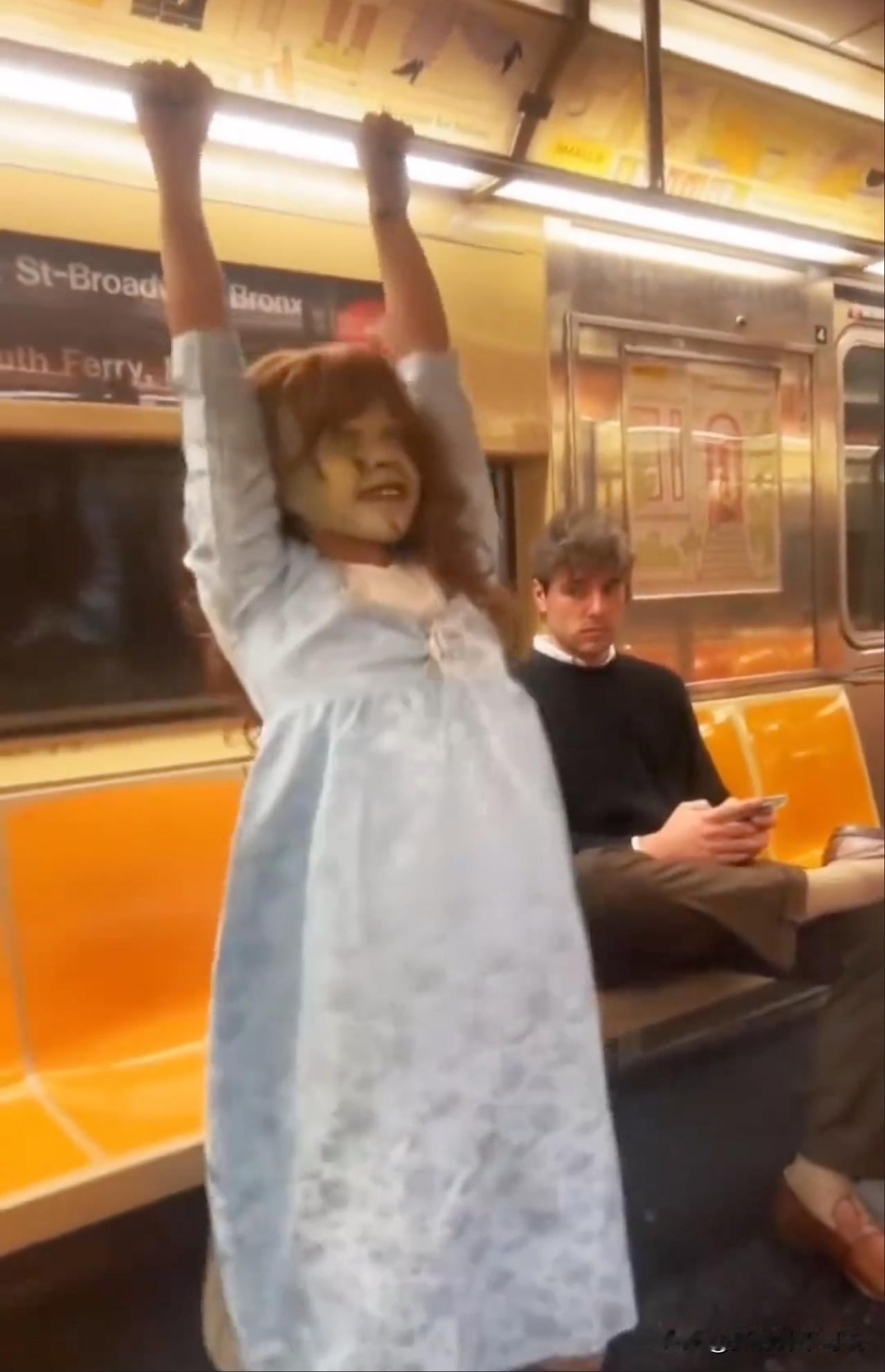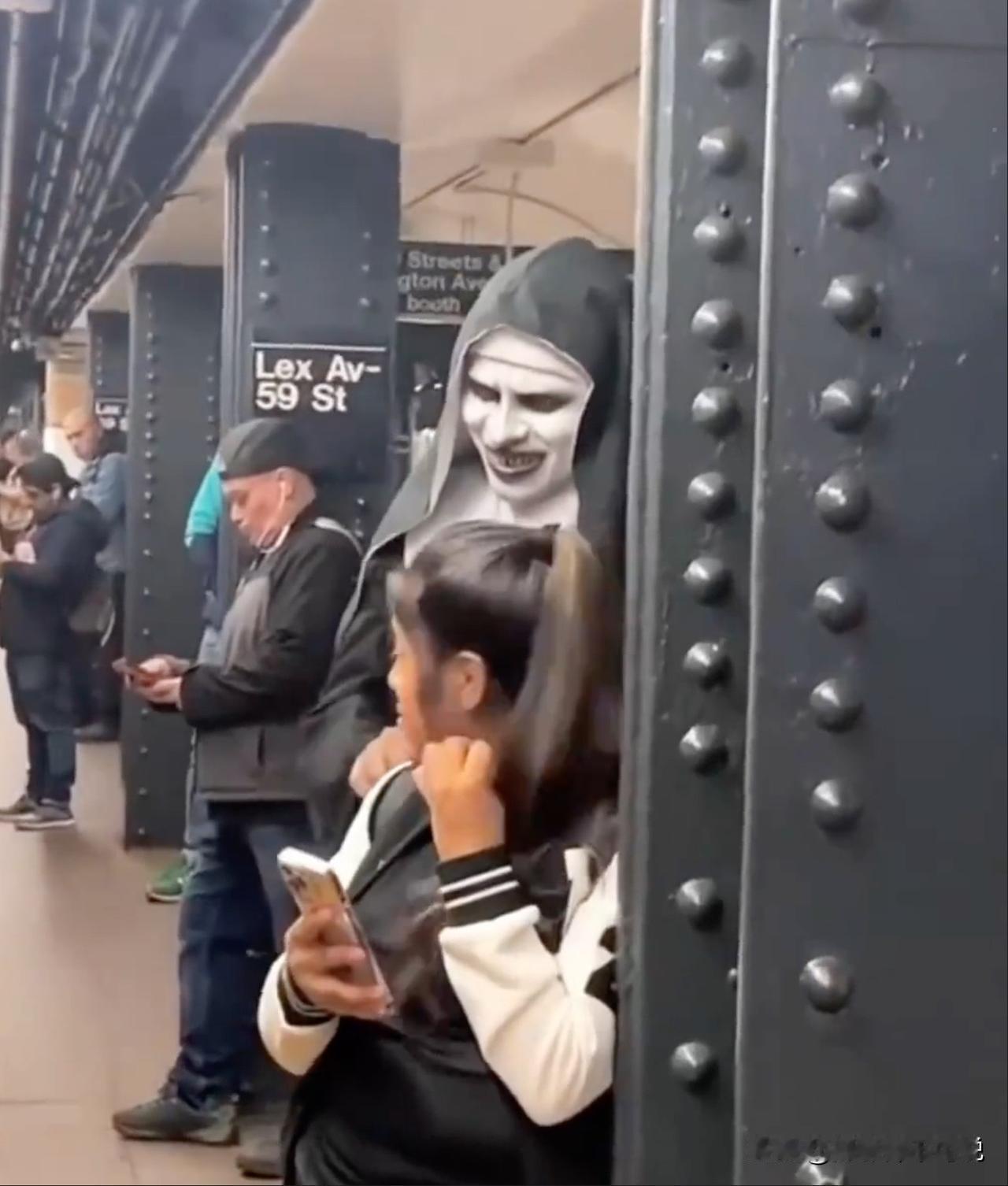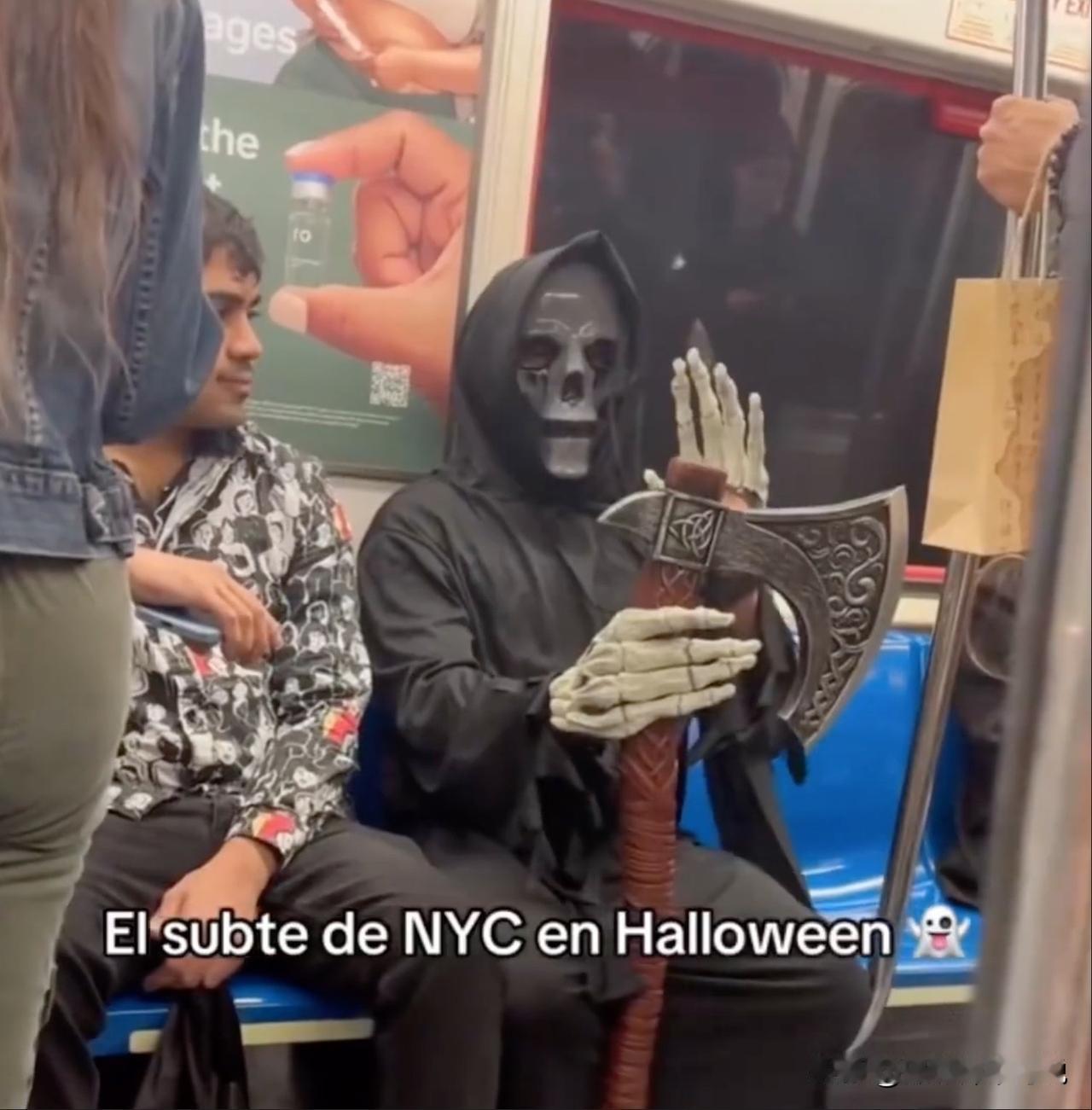 老外这个万圣节真是过出了百鬼夜行的感觉,当你走上这班地铁时,知道的是知道在过万圣节,万一不知道的还以为是踏上了冥界的地铁呢!要我说,万圣节才是老外最重隆重的节日,比圣诞节都还隆重!主要是参与度实在是太高了,几乎人人都会弄点儿行头来搞搞怪。但这太容易让不法分子有机可乘了,比如第四张图片上的这哥们儿,腰间別着斧头,手里面拖着人形道具。这要是被利用一下,后果可就搞笑了!