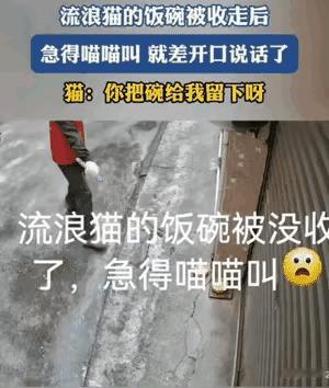这就是恶人,勿以善小而不为,勿以恶小而为之,虽然是一件小事,但是这个男子已经积下了恶,早晚会还的。 一个穿红马甲的男子正在打扫卫生,看到地上有两只碗,旁边还有两只流浪猫,男子把地上的饭碗用工具拿走扔掉了。 如果他只是在打扫卫生,不知道这是流浪猫的饭碗还有情可原,可是他完全明白这是流浪猫的饭碗,看着两只流浪猫急得喵喵叫,他还是狠心的把流浪猫的饭碗丢掉了。 善良的人不会这么做,即使不能添柴加火,也不会釜底抽薪,即使不能喂流浪猫,也不会故意丢掉流浪猫的饭碗。