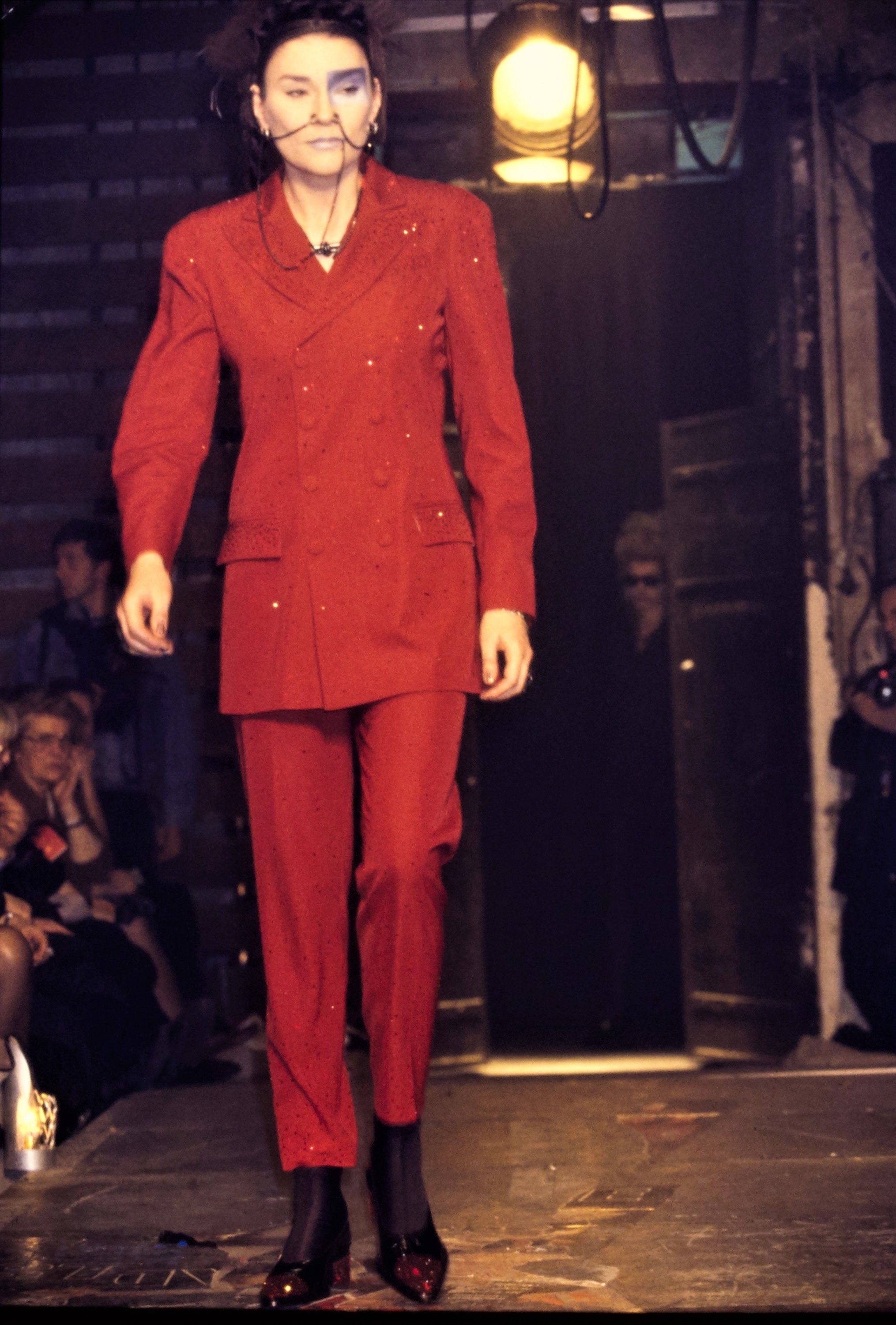哇哦 ,第二套造型同样有惊喜 ~ 红毯 GIVENCHY 古董高定之后刘宇在今日盛典内场又演绎了一套三十年前的 Vintage Look ,来自 Jean Paul Gaultier 1995 年秋冬成衣系列的红色碎钻西装 🔥