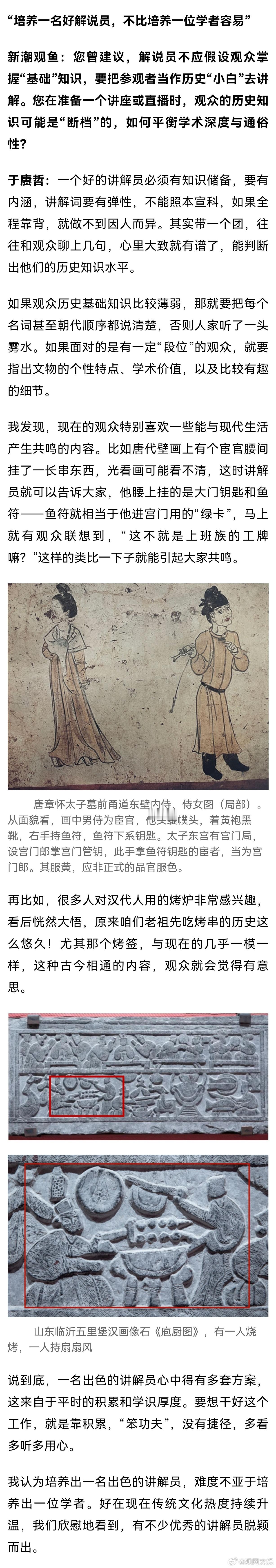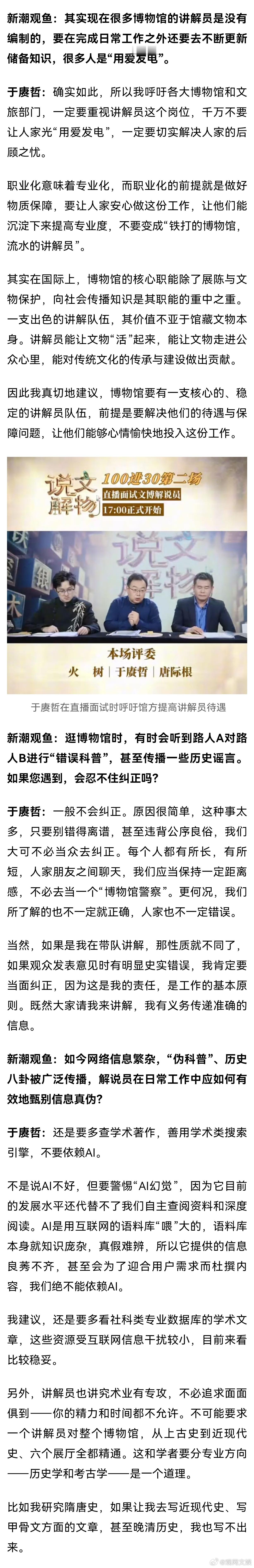 【做历史的粉丝不要做历史的粉圈】于赓哲呼吁保障讲解员待遇近日,山海APP、湖南卫视、芒果TV联合主办的“说文解物”全国文博解说员选拔活动正在如火如荼地展开,观察者网“新潮观鱼”独家对话选拔评委、陕西师范大学历史文化学院教授。